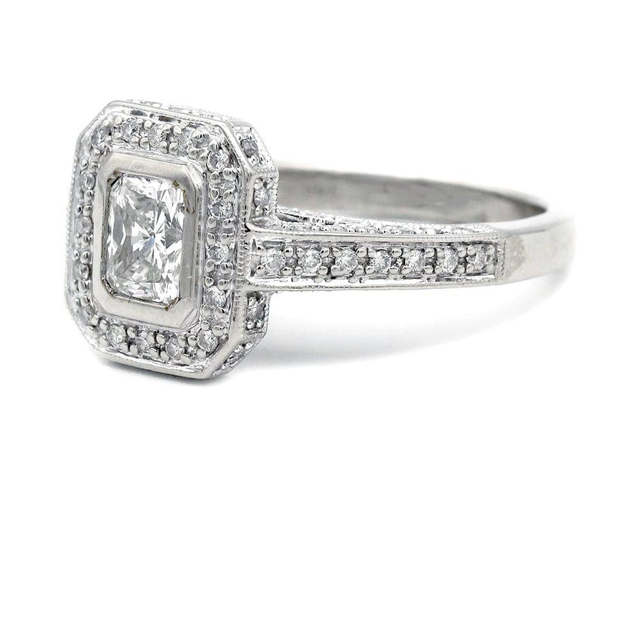 Mid-Century Bezel-Set Set Radiant Cut Diamond Engagement Ring | 14K White Gold | 1980s
