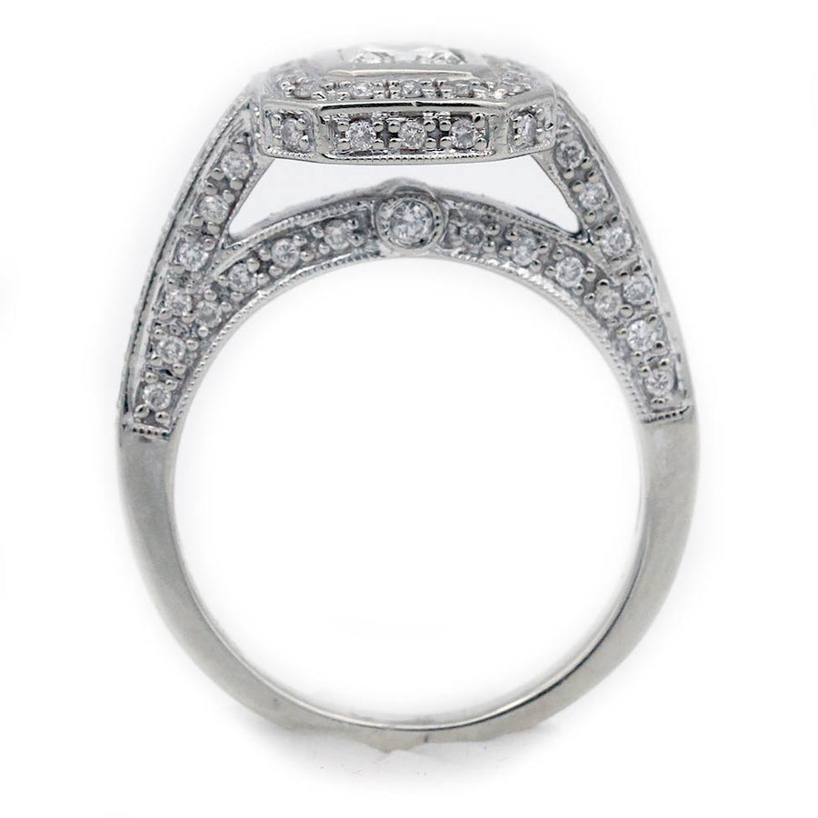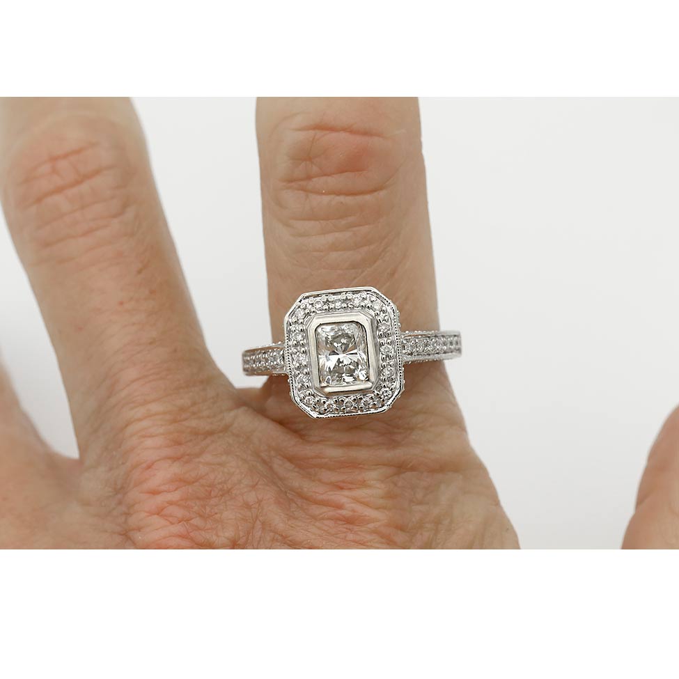 The Wegger ring is an authentic vintage engagement ring from the 1980s. This elegant design centers a .70 ct bezel-set radiant cut diamond with L color and VS2 clarity, framed by sixteen round cut diamonds and sixty six round cut micro-pave diamonds accents that enhance its presence and sparkle. Beautifully crafted in 14 karat white gold, the ring reflects the bold yet refined style of the era. A lovely mid-century engagement ring in very good condition. Size 7.5