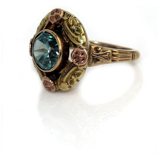 The Emilia ring is an authentic vintage engagement ring circa 1940's. This floral rose gold zircon engagement ring ring centers a natural electric blue .90 carat zircon. Crafted in 14 Kt rose and yellow gold, and completed with intricate rose and yellow gold floral petals. Delicate engravings complete the ring. Perfect to wear on either hand, in very good condition.