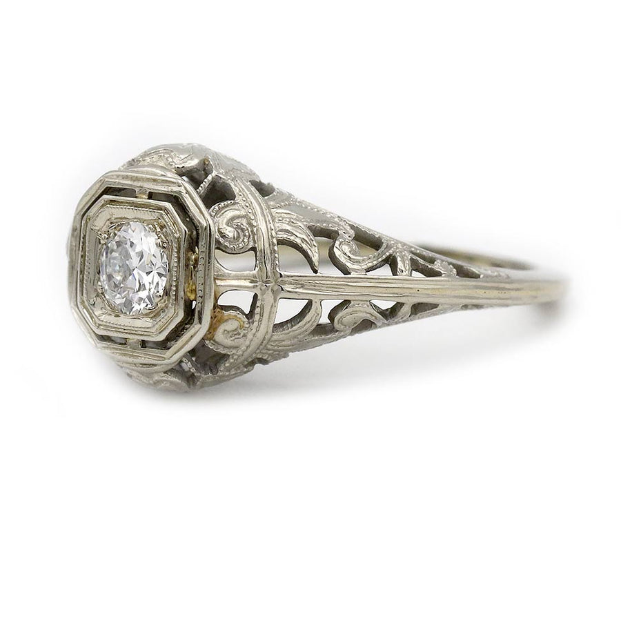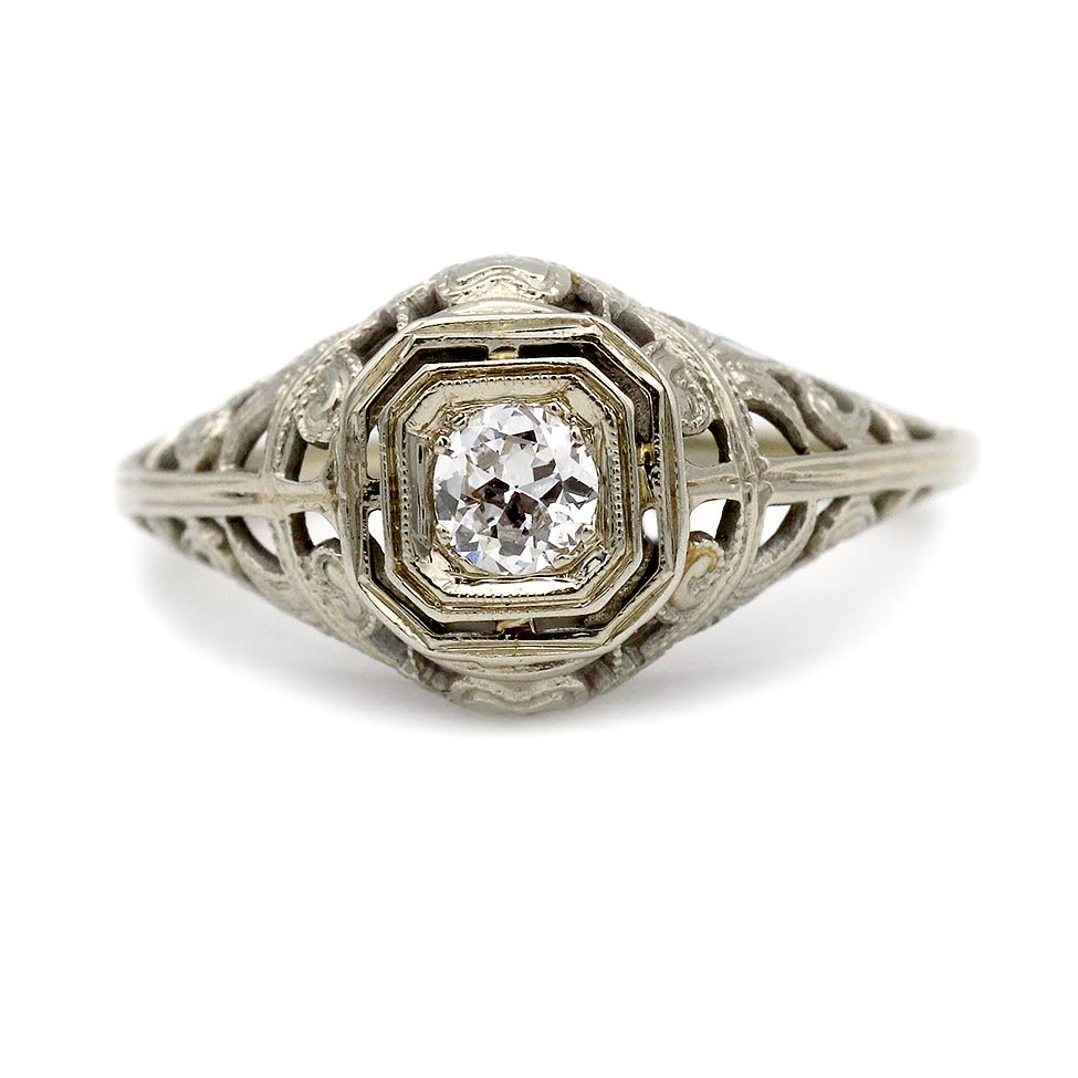 The Mary Claire ring is an authentic Art Deco engagement ring circa 1920's. The ring boasts a .20 carat old European cut diamond of F color, VS2 clarity, residing within a two-tiered octagonal milgrain frame. Crafted in 18 karat white gold, completed with open metal work and floral engravings. A distinctive and delicate solitaire ring. In very good condition.