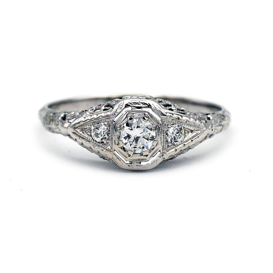 The Brandy ring is an authentic vintage engagement ring from the Art Deco era circa 1930s. The ring highlights a .30 carat old European cut, residing in a geometric octagonal frame. The diamond is flanked by 2 old European cut diamond accents. Finely crafted in a 18 karat white gold, accentuated with open metal work and milgrain engravings. Delicate, superb and very hard to find. In excellent condition!