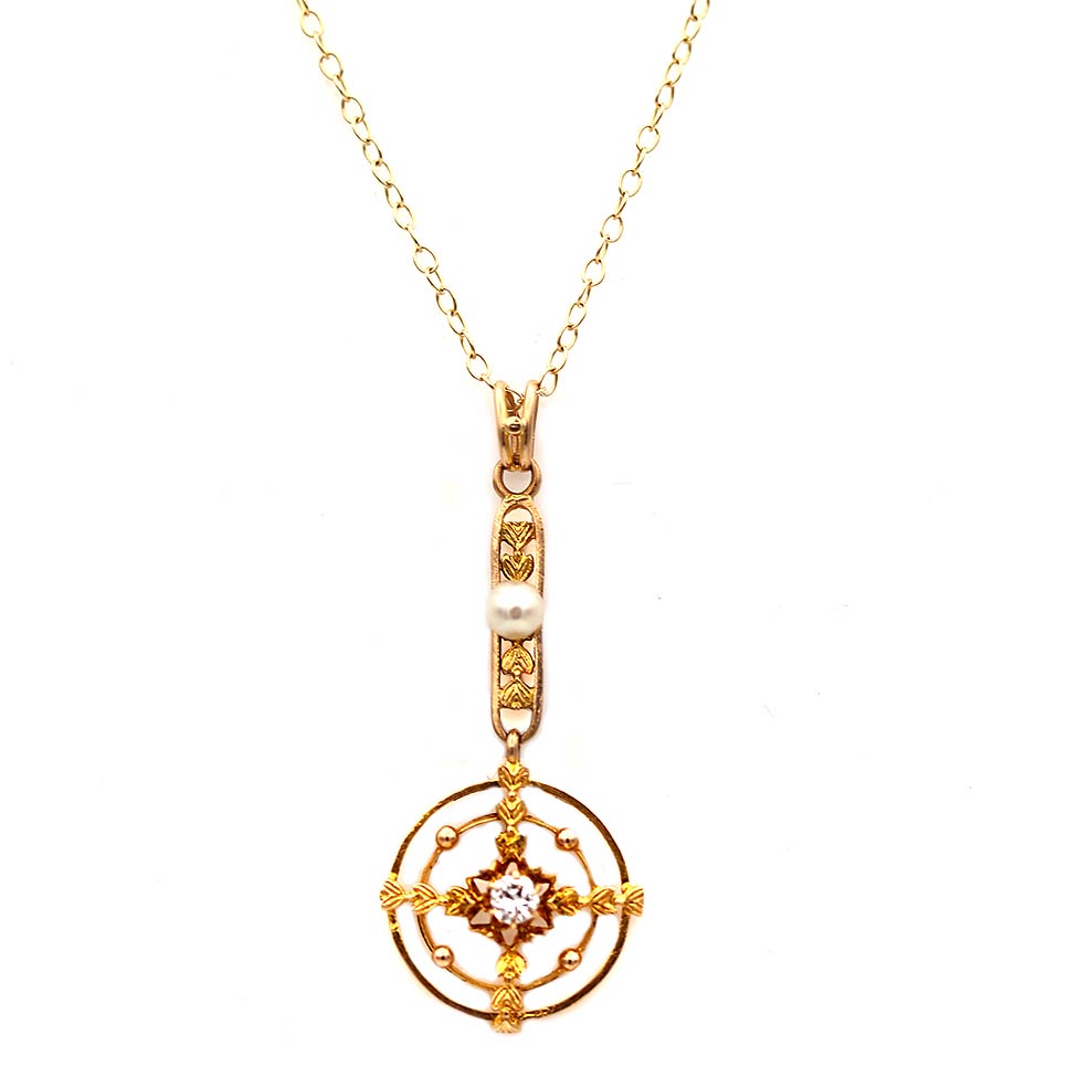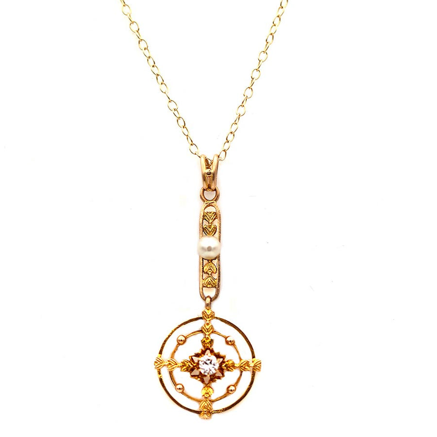 The Kell necklace is an authentic Art Nouveau circular diamond necklace dating to the early 1900s. It features a .10 carat mine cut diamond set in six knife-edge prongs at the center of a circular frame, accented with a single cultured pearl. Crafted in 10 karat yellow gold and detailed with fine filigree engravings, the piece retains beautiful period character. The chain measures 16 inches, and the necklace is in very good condition.