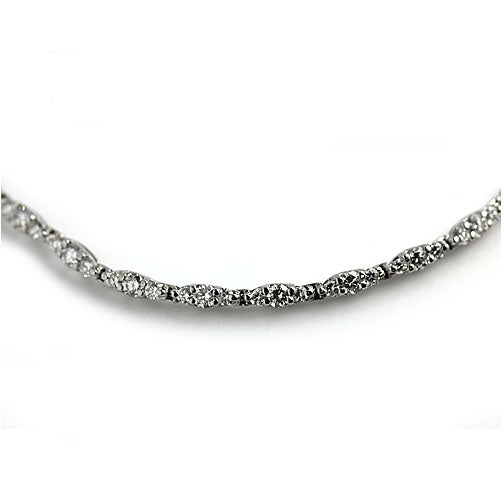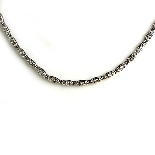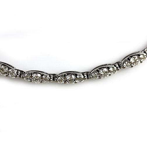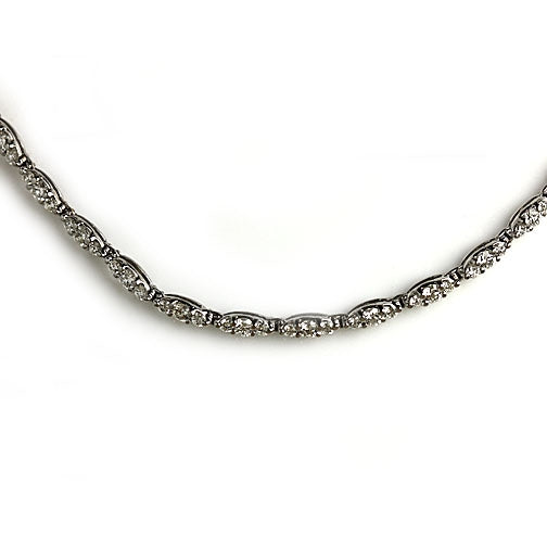Candice is a classic vintage diamond necklace showcasing 110 high quality round cut diamonds weighing 6.50 carats (F color and VS2 clarity).  This beautiful diamond necklace was handcrafted in the 1990's in 18 Kt white gold. A classic and timeless necklace. Length is 16 "