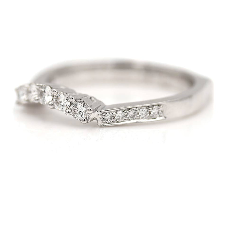 Add a little zest to your vintage engagement ring with the Melanie band. This estate contoured wedding band features 15 bright-white round diamonds, weighing .30 carat with E color and VS2 clarity. Crafted in the 1990s, in 18 Kt white gold, this is the perfect complement to your vintage engagement ring. In excellent condition.