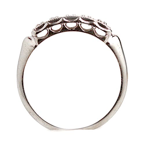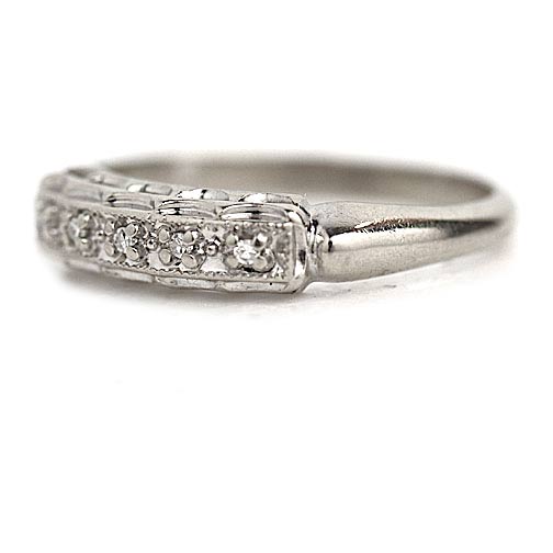The Merrie band is an authentic vintage wedding band from the Mid-Century era, circa 1950s. The band features five single-cut diamonds weighing approximately .10 carats (G color, VS2 clarity). Crafted in 14-karat white gold, the design is detailed with delicate milgrain engravings. This timeless band is in good condition and is perfect to stack with other bands or to complement your engagement ring. Ready to ship.