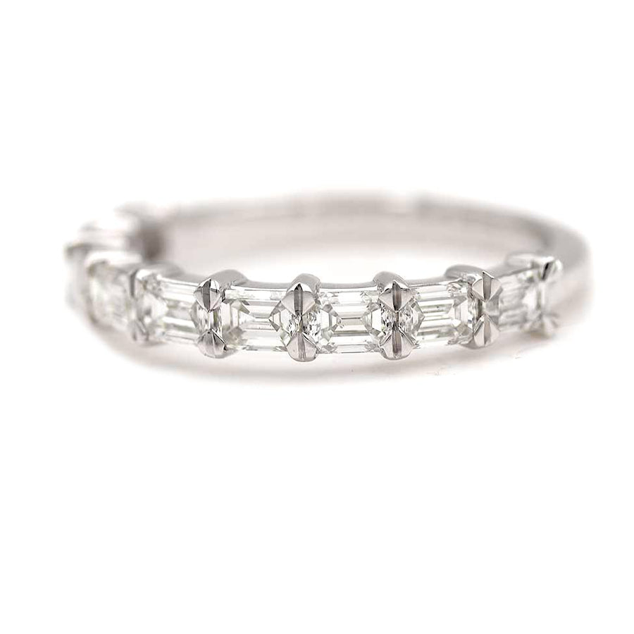 The Shaw band is a vintage-inspired wedding band thoughtfully made by VDR.com. It features nine emerald cut diamonds totaling 1.35 carats, graded F color with VS2 clarity. Superbly handcrafted in recycled platinum and made with care in New York City, this elegant band highlights the clean lines and refined symmetry of emerald cut diamonds. Versatile and timeless, it is perfect to wear on either hand or stacked with your favorite vintage ring.