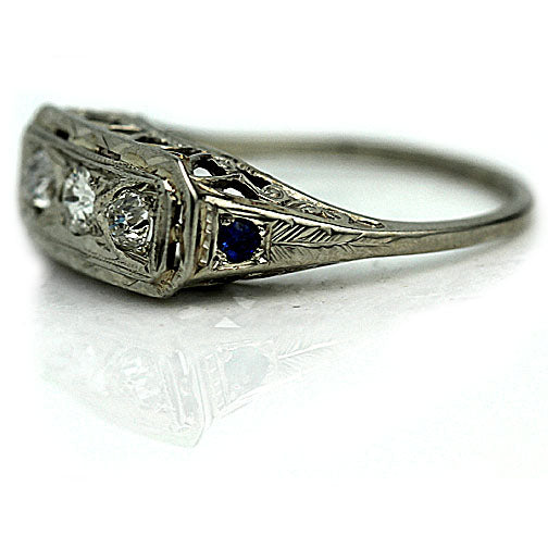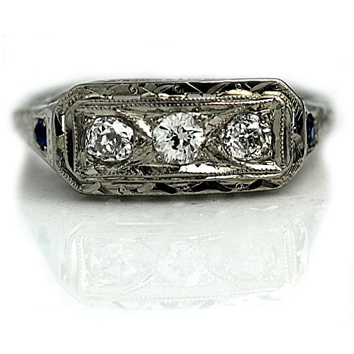 Antique Three Stone .40 CTW Diamond Sapphire Vintage Engagement Ring Heart Motif