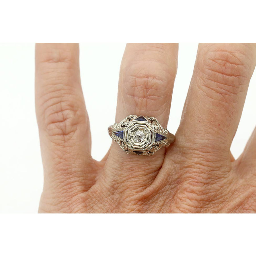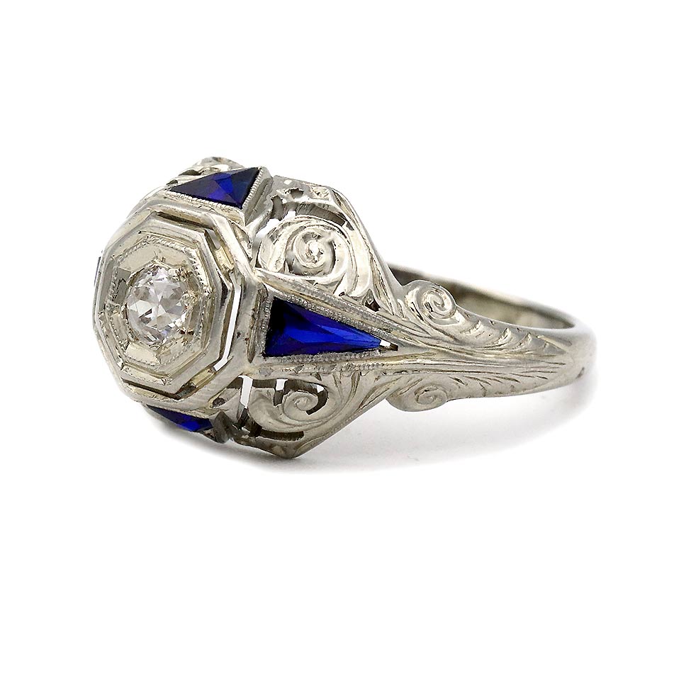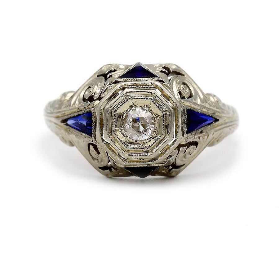 The Kammie ring is an authentic vintage octagonal engagement ring circa 1930's. The ring features a .15 carat old mine cut diamond of G color, SI2 clarity, set in a two tiered octagonal frame. The diamond is flanked by 4 synthetic kite and triangular shaped sapphires accents. Handcrafted in 18 karat white gold, completed with swirls of metal work and filigree engravings. A rare, lovely Art Deco ring. In excellent condition.