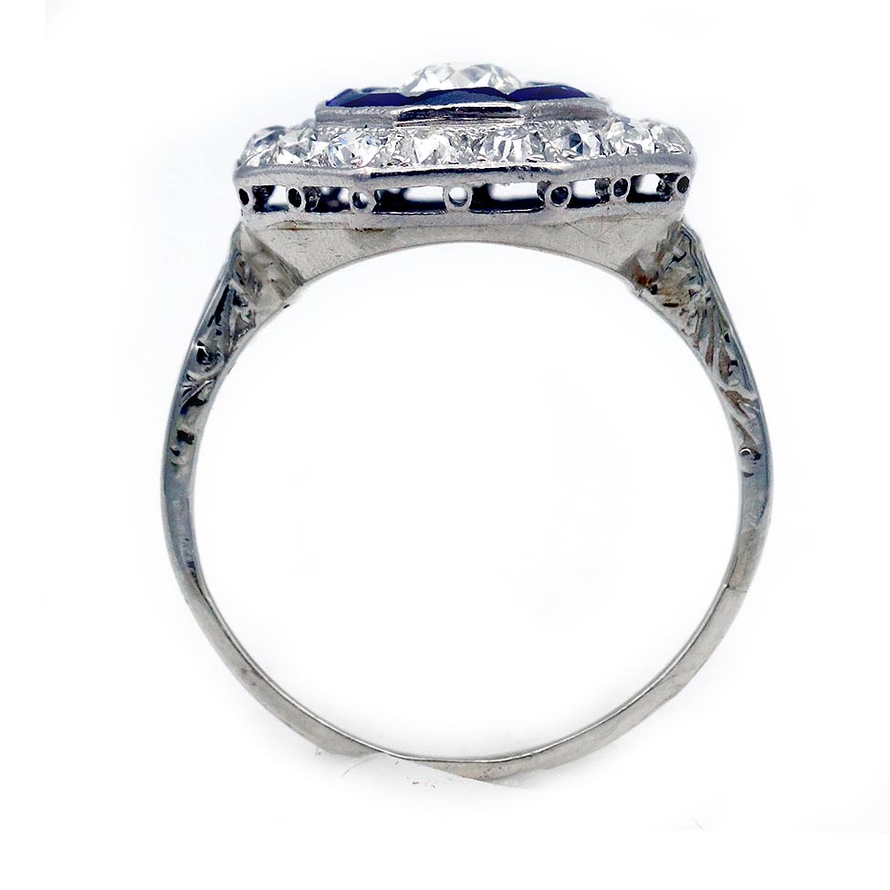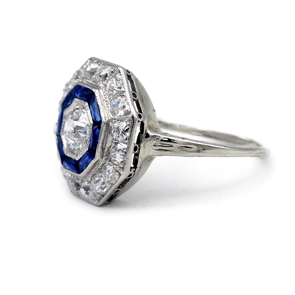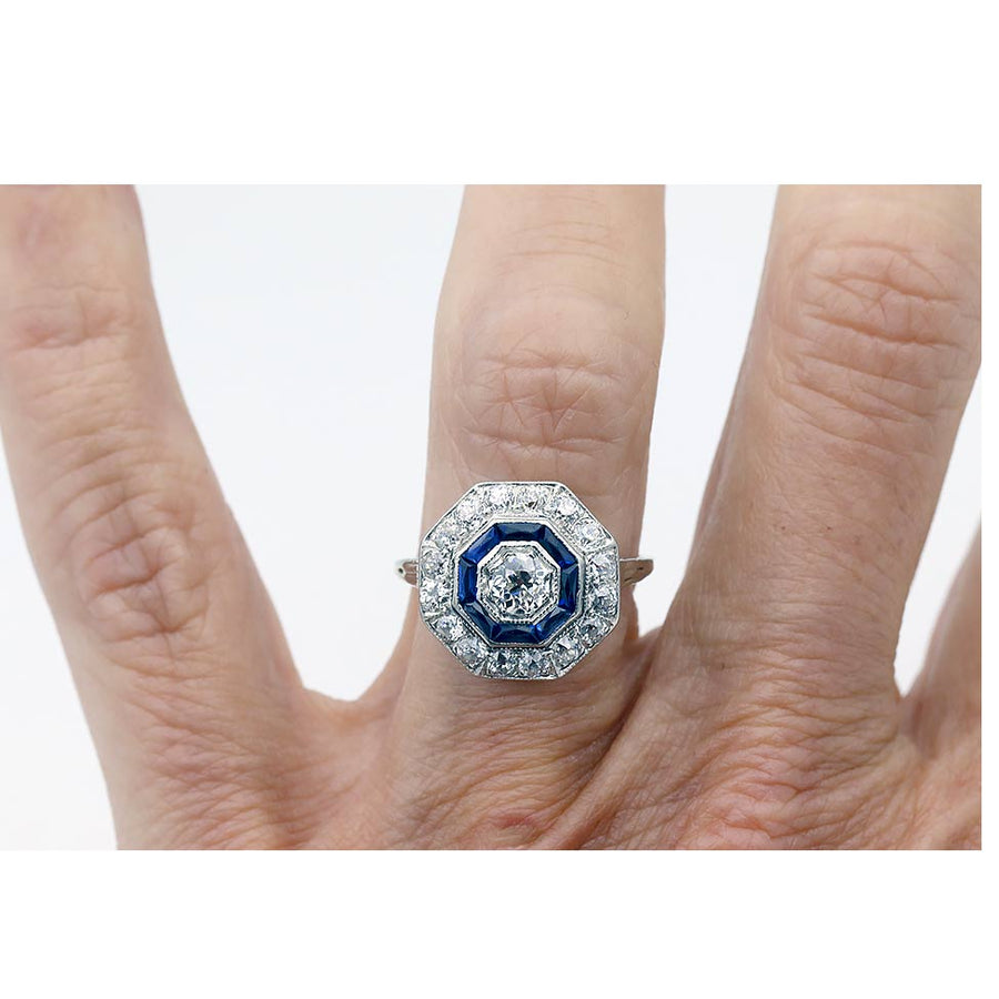 The Madaliene ring is an authentic vintage engagement ring from the Art Deco era circa 1930s. This Art Deco diamond and sapphire halo engagement ring features a .35 carat old mine cut diamond, residing in a geometric octagonal frame. The diamond is surrounded by a delicate halo of 8 synthetic baguette sapphires and 16 old mine cut diamond accents. Crafted in platinum (14 kt white gold ring shank), beautifully accentuated with milgrain engravings. A rare, one of a kind vintage ring. They don't come any finer. In very good condition.