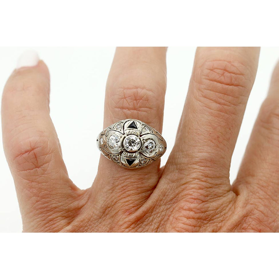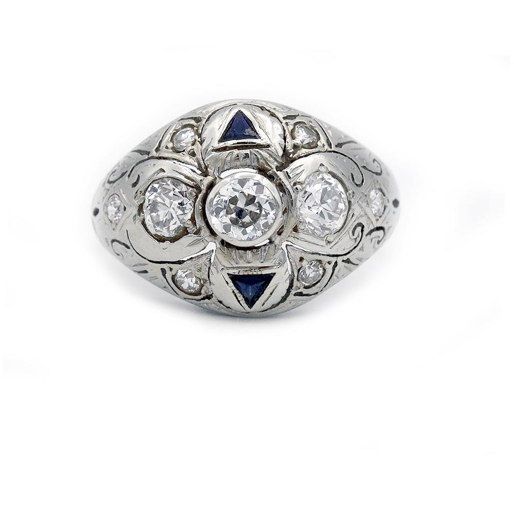 The Melanie ring is an authentic vintage dome engagement ring from the Art Deco Era circa 1920s. The ring featuring 3 centered old mine-cut diamonds weighing .75 carat. The diamonds are surrounded by 2 north-south natural triangle sapphires and 6 mine cut diamond accents. Crafted in 14 karat white gold, completed with delicate open metal work and filigree engravings. An eye-catching cocktail ring that is perfect to wear on either hand. In good condition.