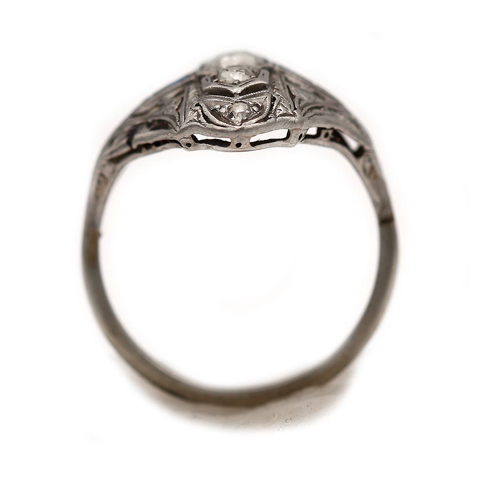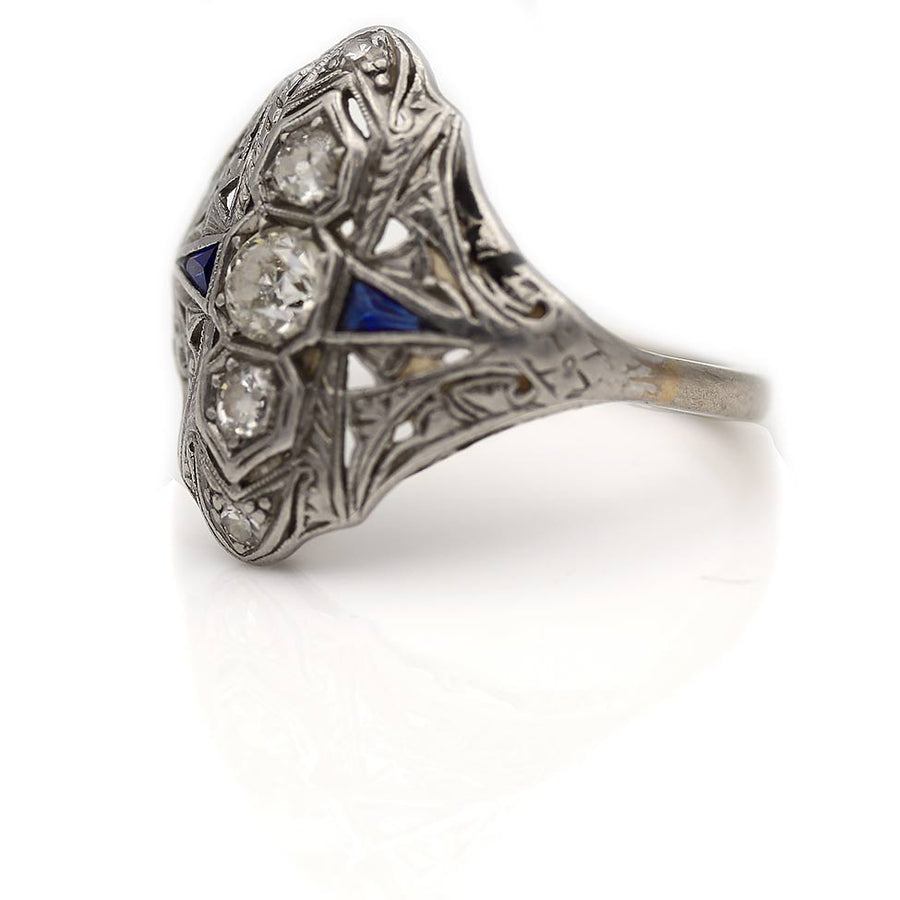 The Cobie ring is an authentic vintage engagement ring from the Art Deco era circa 1920s. The ring features a trio of gleaming mine cut diamonds weighing approximately .55 carat of H color VS2 clarity. the diamonds are flanked by 2 synthetic kite shape sapphires. Crafted in platinum (18kt ring ring shank), completed with open metal work and filigree engravings. A stunning dinner ring, perfect to wear on either hand! In very good condition.