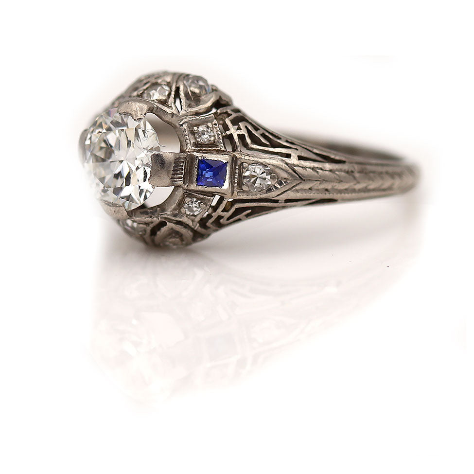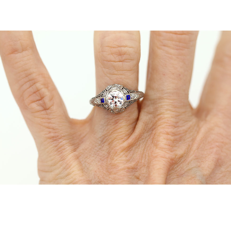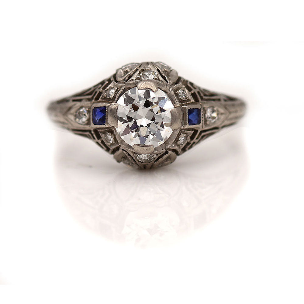 Vintage .99 CTW European Cut Diamond Square Cut Sapphire Art Deco Engagement Ring