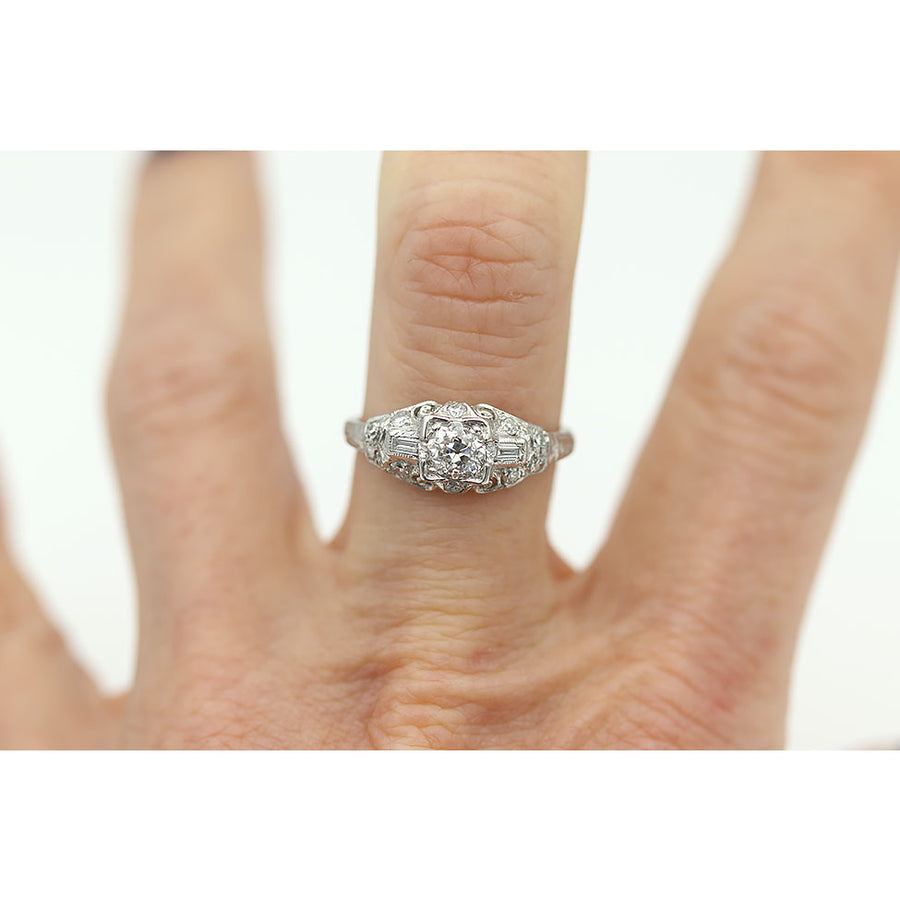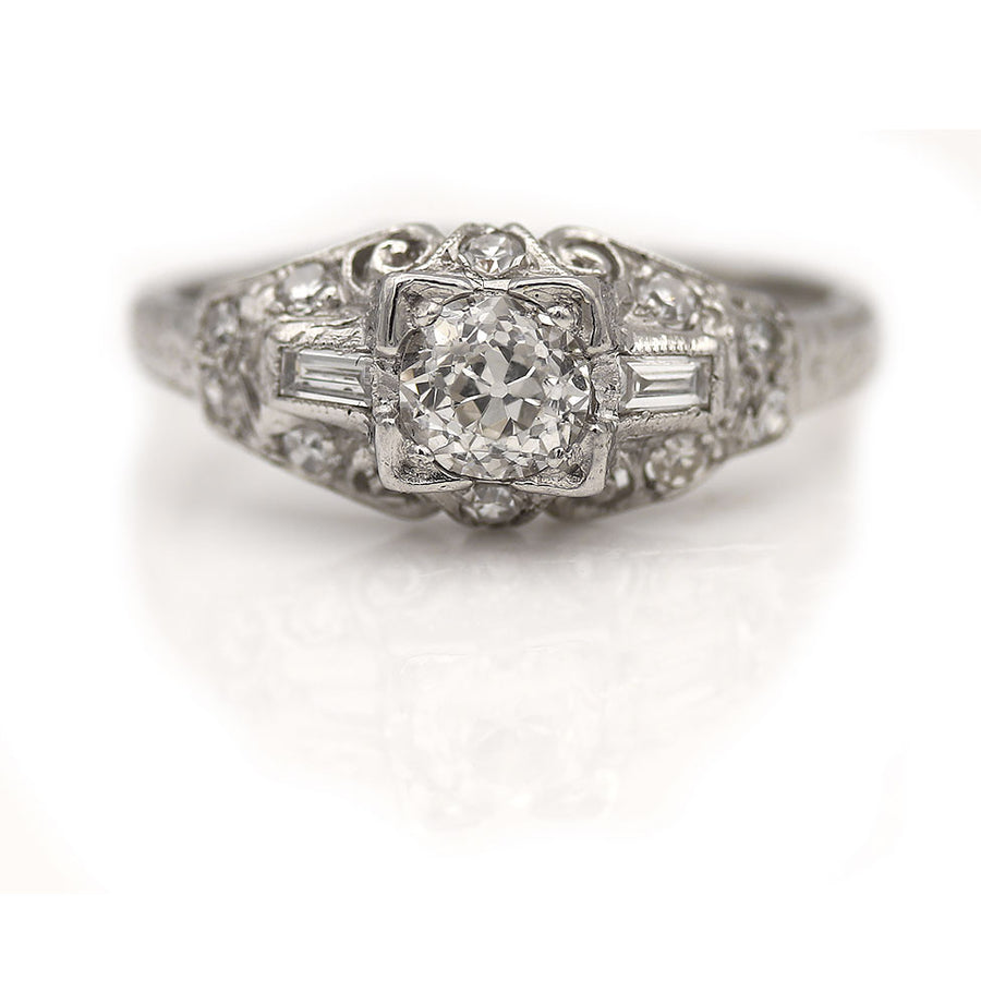 The Alma ring is an authentic vintage engagement ring from the Art Deco era circa 1940's. The ring features a bright-white .60 carat old mine cut diamond of H color, SI1 clarity, residing in a geometric square frame. The diamond is flanked by 2 straight baguette cut diamonds and 13 old European cut diamond accents. Crafted in platinum, accentuated with swirls of metal work and filigree engravings. A consummate and one of a kind Art Deco piece. In very good condition.