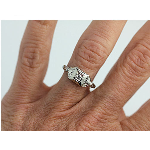 Petite Antique Old Mine Cut Diamond Engagement Ring .08 Ct 14K White Gold Square Frame Circa 1930s