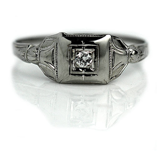 The Ohio ring is an authentic antique engagement ring dating to the 1930s. It features a .08 carat old mine cut diamond of E color and VS2 clarity, set within a geometric square frame that gives the ring a clean and balanced appearance. Beautifully handcrafted in 14 karat white gold, the setting is finished with delicate milgrain and linear engraving characteristic of the period. Offered in good antique condition.
