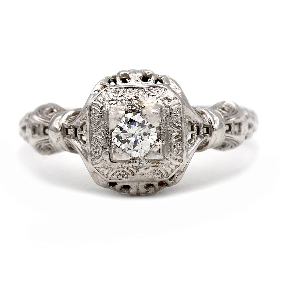 The Beca ring is an authentic Art Deco diamond engagement ring circa 1930s. The ring features a .25 carat transitional cut diamond of E color, SI1 clarity, residing in a geometric square filigree frame. Beautifully crafted in 18 karat white gold, accentuated with open metal work and filigree engravings. A timeless Art Deco treasure. In very good condition.