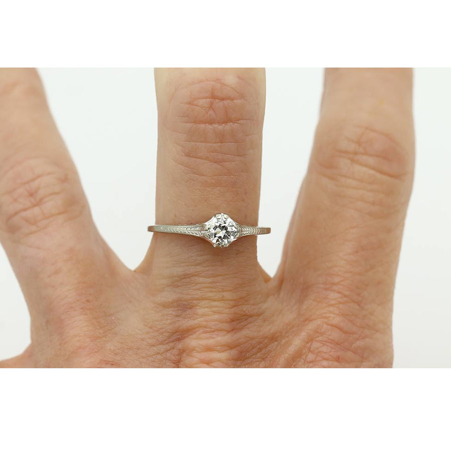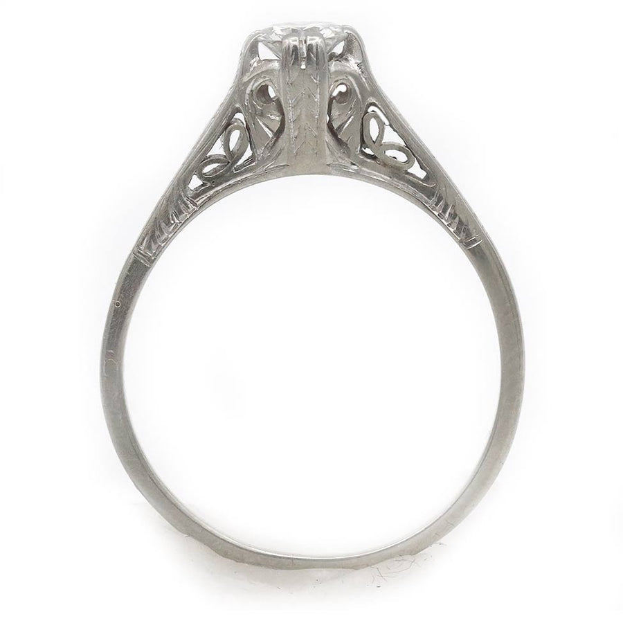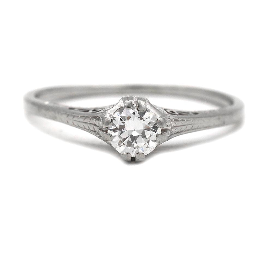 The Rossie ring is an authentic vintage engagement ring from the Art Deco era, dating to the 1930s. It features a bright-white .35 carat old European cut diamond graded F color and VS2 clarity, set to stand tall in an elegant 18 karat white gold setting. The ring is finished with delicate filigree engraving and open metalwork that highlights its refined Art Deco craftsmanship. A lovely vintage solitaire, offered in very good vintage condition.