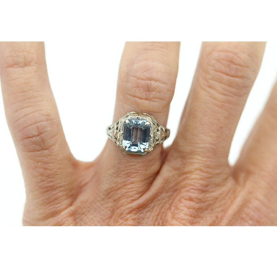 The Sinta ring is an authentic Art Deco aquamarine engagement ring dating to the 1930s. It features a natural 1.85 carat square cut sky-blue aquamarine, prong set at the center and surrounded by delicate milgrain engraving. Beautifully crafted in 14K white gold, the setting is finished with open metalwork and filigree engravings typical of the Art Deco era. A striking non-diamond engagement ring, preserved in very good vintage condition.