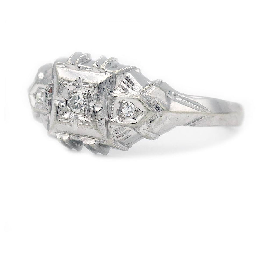 The Harmony ring is an authentic Art Deco engagement ring dating to the 1930s. It features a .10 ct single-cut diamond graded F color and VS2 clarity, set within a distinctive two-tiered square milgrain frame. The center diamond is flanked by two single-cut side diamond accents, adding subtle sparkle while maintaining a refined, low-profile silhouette. Handcrafted in 18 karat white gold and finished with delicate filigree and milgrain engravings, this vintage ring remains in very good condition.