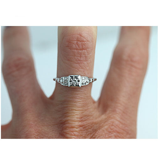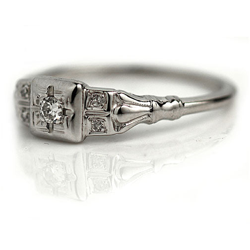 The Vivianne ring is an authentic vintage engagement ring from the Art Deco era circa 1930s. The ring boasts a .10 carat old mine-cut diamond of G color, VS2 clarity, residing in a geometric square frame. The diamond is flanked by 4 single cut diamond accents. Crafted in 14 karat white gold, accentuated with delicate engravings. A consummate Art Deco piece! In very good condition.