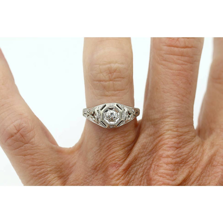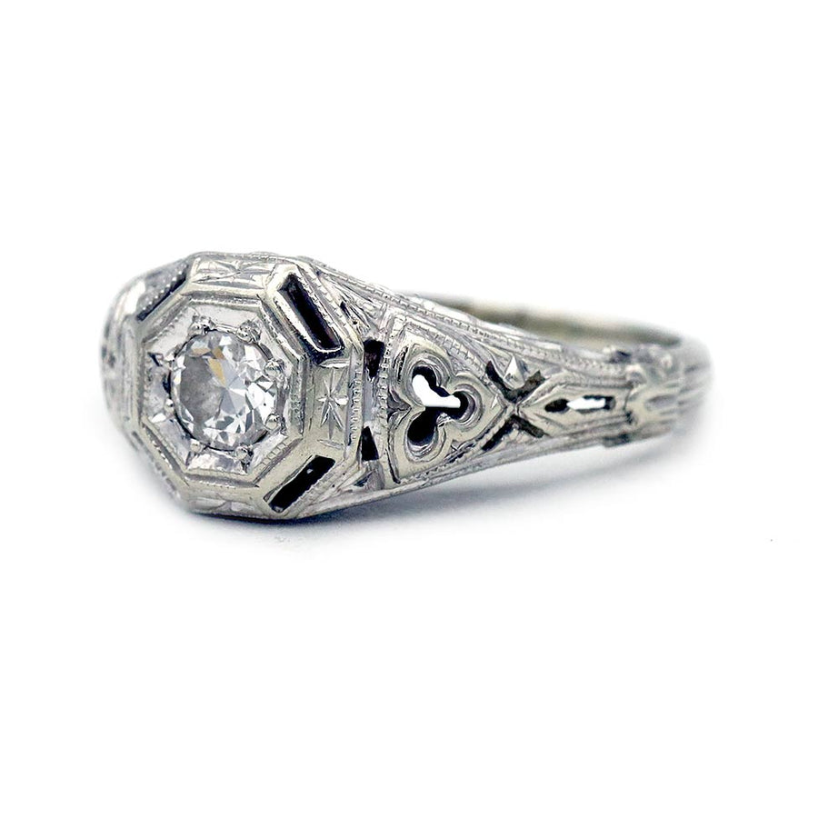 The Barrie ring is an authentic vintage engagement ring from the Art Deco era, dating to the 1930s. It features an Old European cut diamond weighing approximately .20 carats, graded G color and VS2 clarity, set as a solitaire within a distinctive two-tiered octagonal open-face frame. Crafted in 18 karat white gold, the ring is finished with delicate open metalwork and fine filigree engravings typical of the Art Deco period. A sweet and distinctive vintage piece in very good condition.