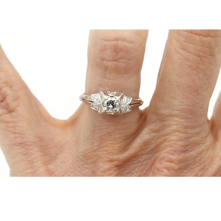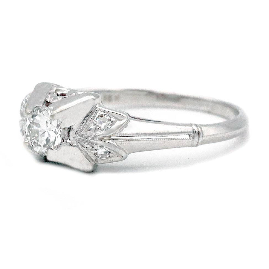 The Kelley H ring is an authentic vintage engagement ring from the Art Deco era, dating to the 1930s. The design centers a bright white prong-set .25 ct old European cut diamond, flanked by four single cut diamond accents that add subtle sparkle while maintaining the ring’s clean, balanced look. Beautifully crafted in 18 karat white gold, the ring is finished with delicate milgrain engraving throughout. A crisp and refined Art Deco vintage piece preserved in very good condition.