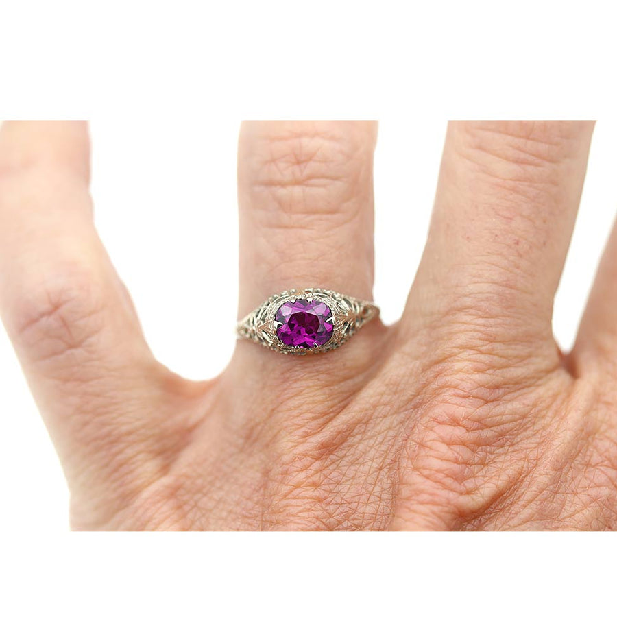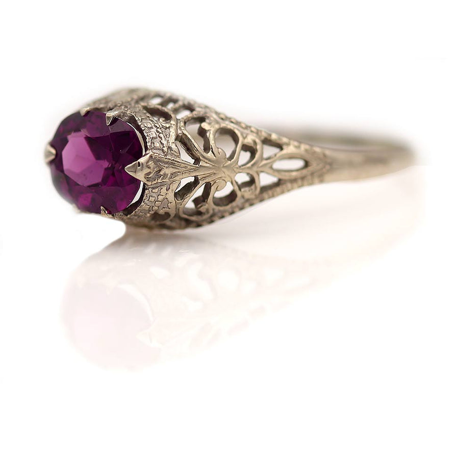 The Dennis ring is an authentic vintage gemstone engagement ring from the Art Deco era, dating to the 1930s. It features a natural cushion cut garnet weighing approximately .90 carats, set in an east–west orientation and displaying a rich, intense purple hue. Beautifully crafted in 14K white gold, the setting is accented with delicate milgrain engravings and refined open metalwork characteristic of the period. A sweet and distinctive Art Deco gemstone engagement ring, preserved in very good vintage condition.