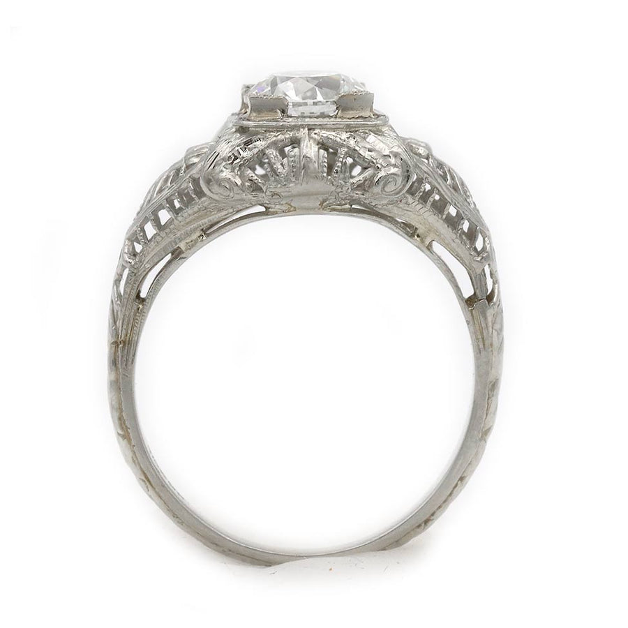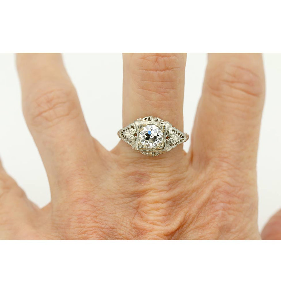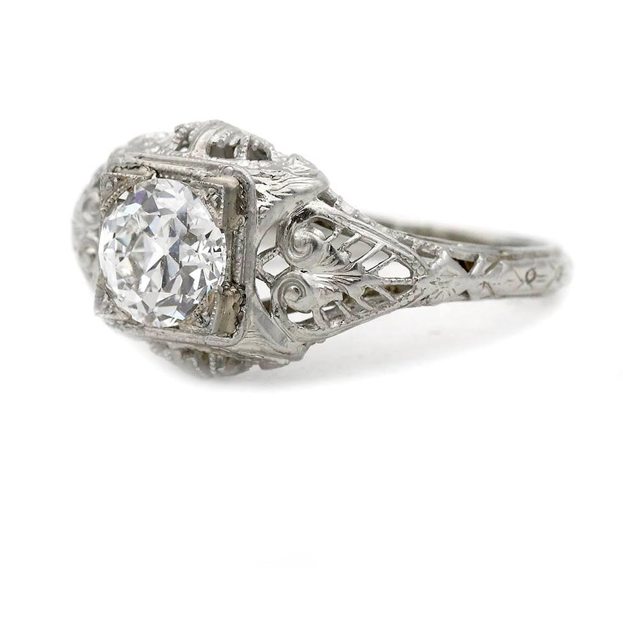 The Rosalind A ring is an authentic vintage diamond engagement ring from the Art Deco era circa 1930s. The ring boasts a GIA certified .97 carat old European cut diamond of H color, SI2 clarity, residing within a geometric square milgrain frame. Beautifully crafted in 18 karat white gold, accentuated with swirling metal work and delicate filigree engravings. A vintage treasure. In pristine condition.