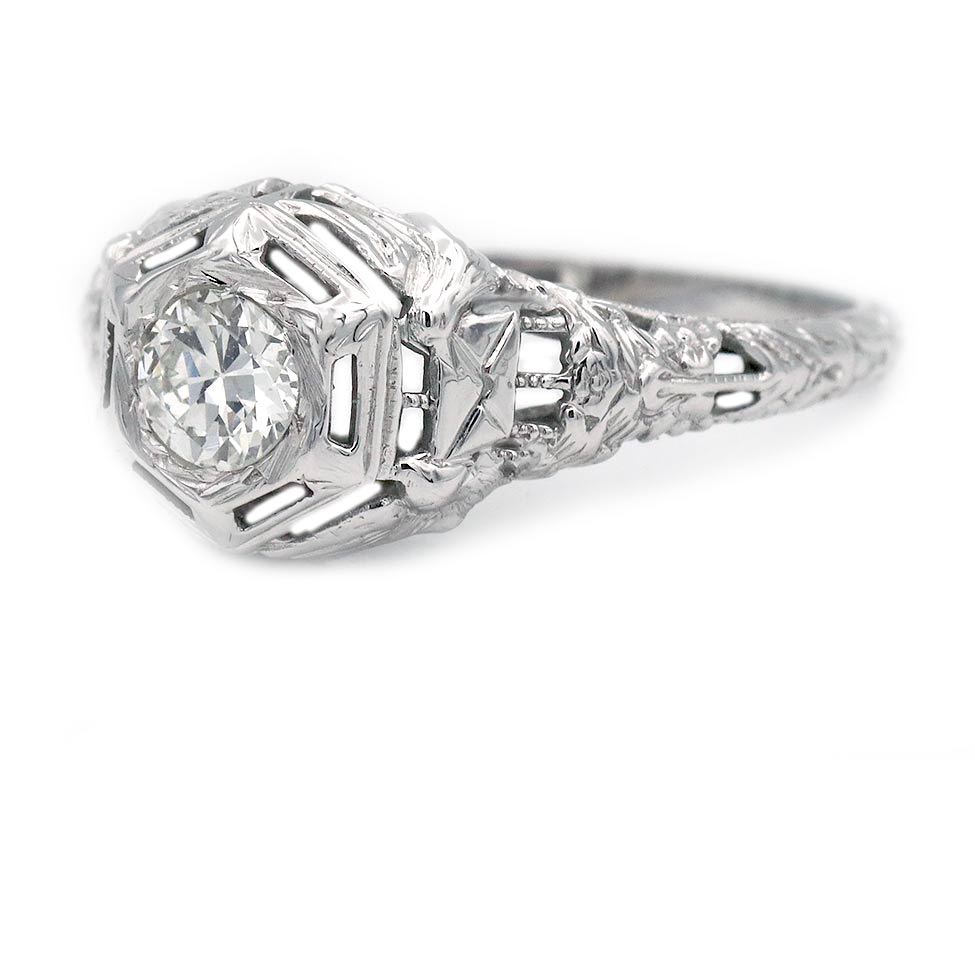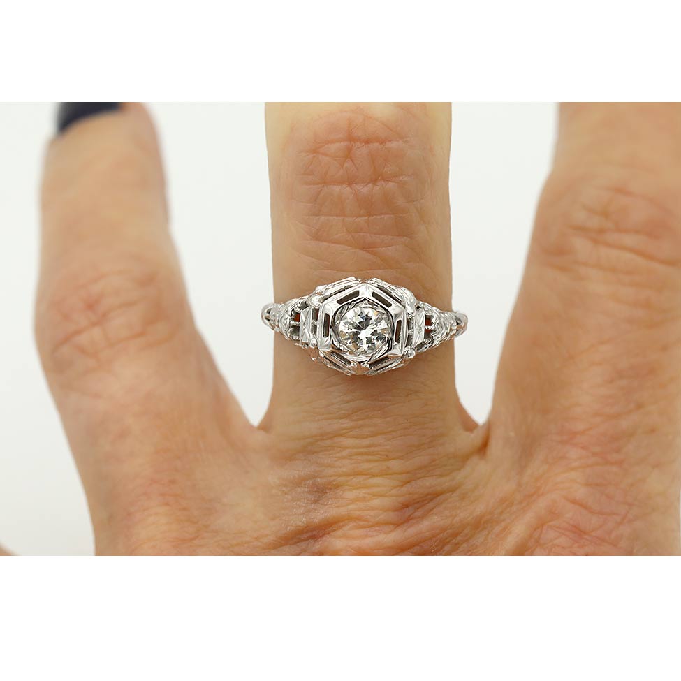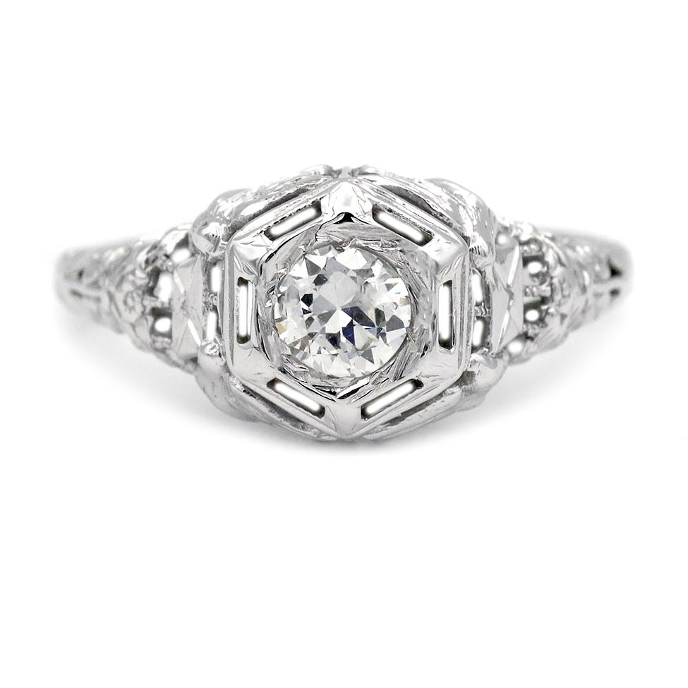 The Merri ring is an authentic vintage engagement ring from the Art Deco era, dating to the 1930s. It features an old European cut diamond weighing approximately .35 carats, graded I color and VS2 clarity, set as a classic solitaire within a geometric hexagonal frame. Handcrafted in 18 karat white gold, the ring is accented with refined open metalwork and distinctive filigree engravings characteristic of the Art Deco period. A striking vintage ring in very good condition.