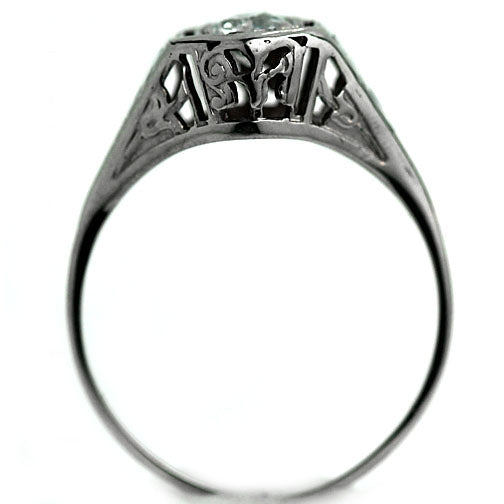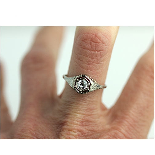 Vintage .35 Ct Old European Cut Diamond Hexagonal Solitaire Antique Engagement Ring with Floral Engravings