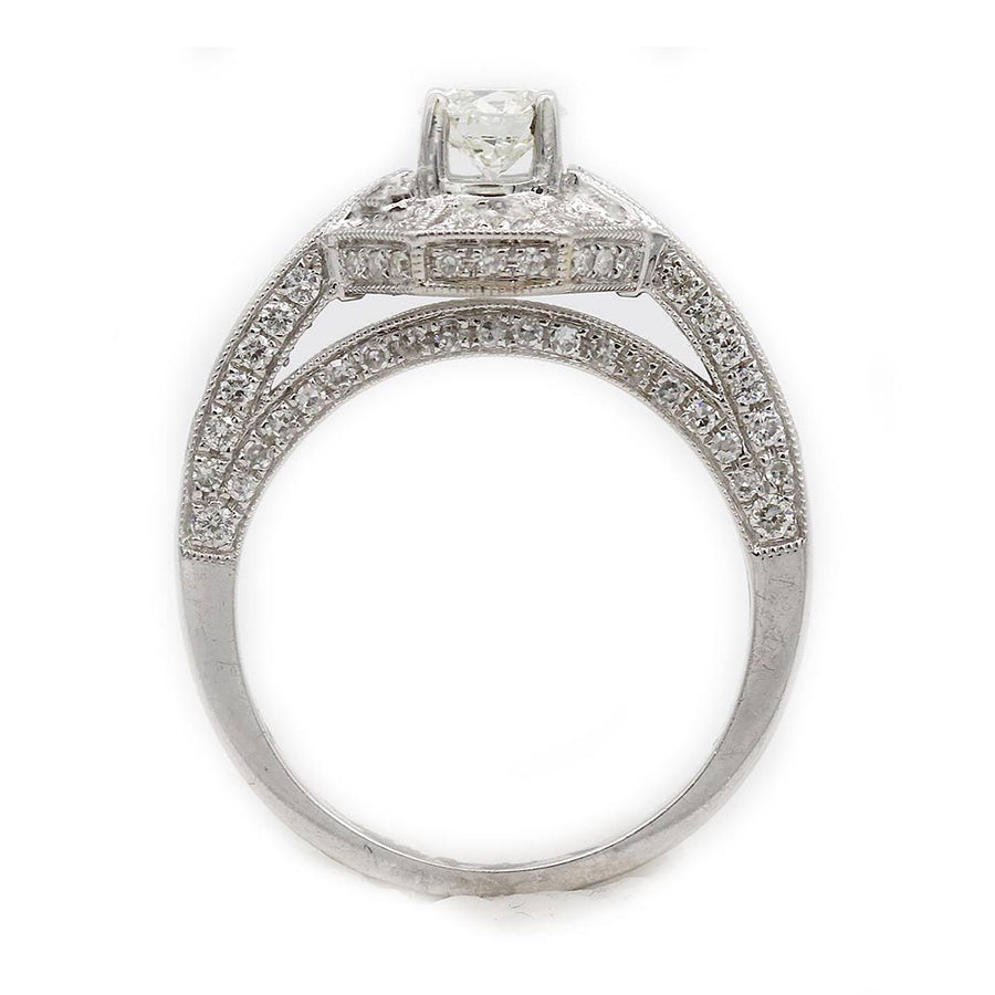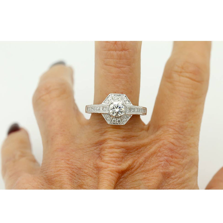 The Brandi ring is an authentic estate vintage diamond engagement ring dating to the 1980s. It features a GIA-certified .52 carat old European cut diamond, graded J color and SI2 clarity. The center stone is framed by sixteen channel-set princess cut diamonds and twenty-four pavé-set round diamond accents, adding depth and sparkle to the design. Crafted in 18 karat white gold, the setting is finished with delicate milgrain engraving. A lovely estate engagement ring with timeless appeal, offered in very good vintage condition.