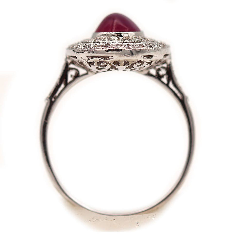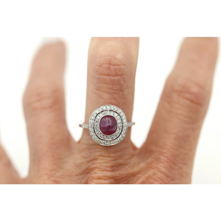Estate 1.00ct Cabochon Ruby Two-Tiered Diamond Halo 18K White Gold Ring