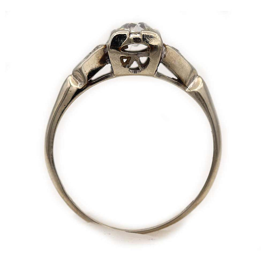 The Loewe ring is an authentic vintage engagement ring dating to the 1940s. At its center is a .30 carat old mine cut diamond, set within a crisp geometric square frame and flanked by two single-cut diamond accents. Expertly crafted in 18 kt white gold, the ring is finished with open metalwork and delicate filigree engraving, reflecting the refined design sensibilities of the era. A classic vintage ring, offered in good condition.