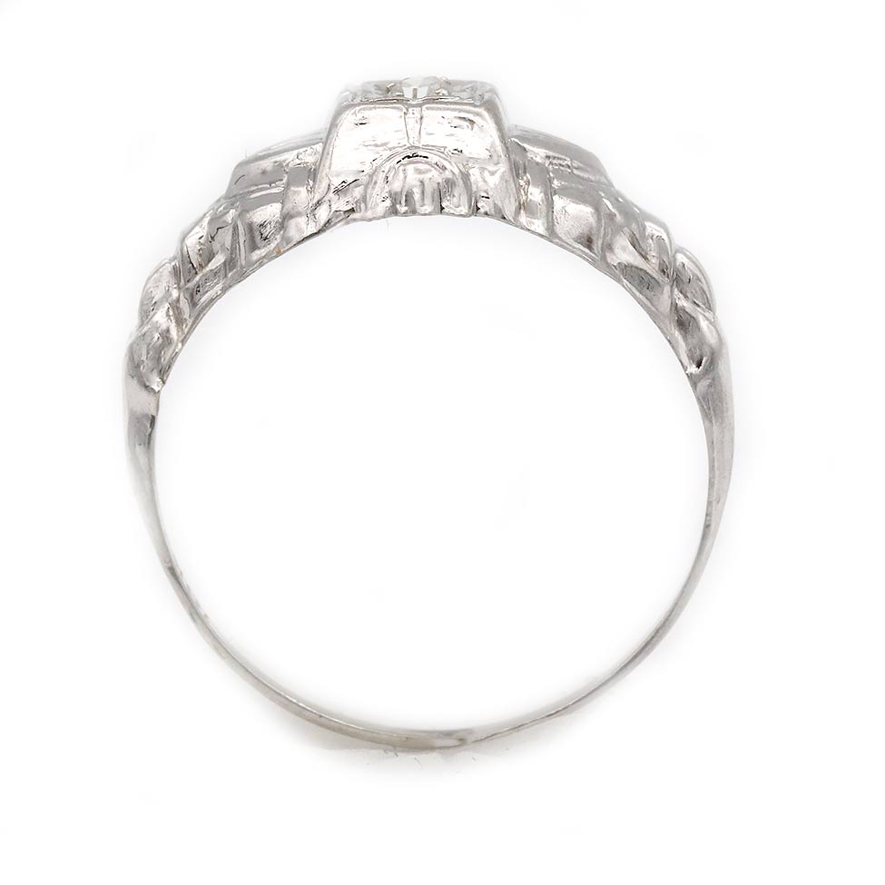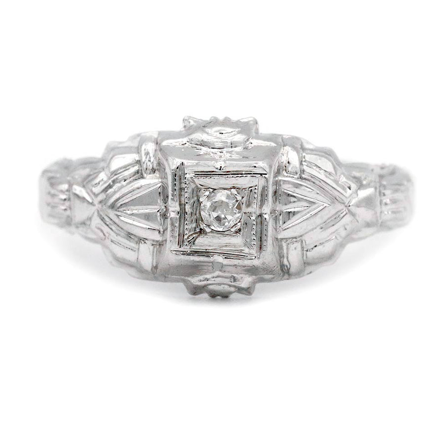 The Portia ring is an authentic antique diamond engagement ring from the Art Deco era, dating to the 1930s. This petite vintage design features a .05 carat single cut diamond, graded F color and SI1 clarity, set within a crisp square frame. Delicate filigree engravings surround the center stone, highlighting the refined craftsmanship typical of true Art Deco jewelry. Crafted in 10 karat white gold, this sweet and understated engagement ring is offered in very good vintage condition.