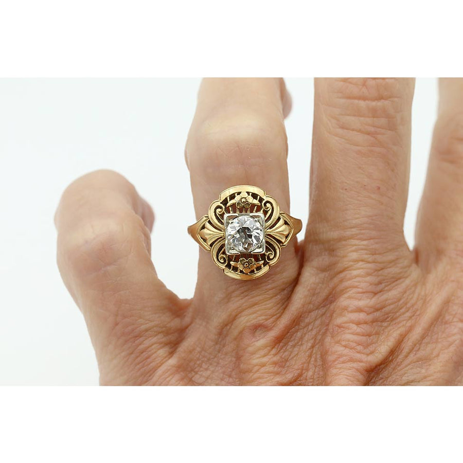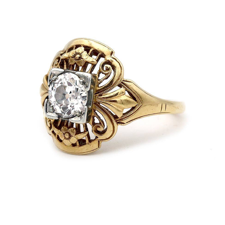 The CR ring is an authentic vintage engagement ring from the Art Deco era, dating to the 1940s. This ring features a .80 carat old European cut diamond accompanied by an AGI certificate stating J color and VS2 clarity, set within a geometric square frame and accented with delicate filigree engraving. Beautifully handcrafted in 14 karat two-tone gold, the setting is finished with fine milgrain detail and open metalwork characteristic of the period. A timeless vintage engagement ring, offered in very good condition.