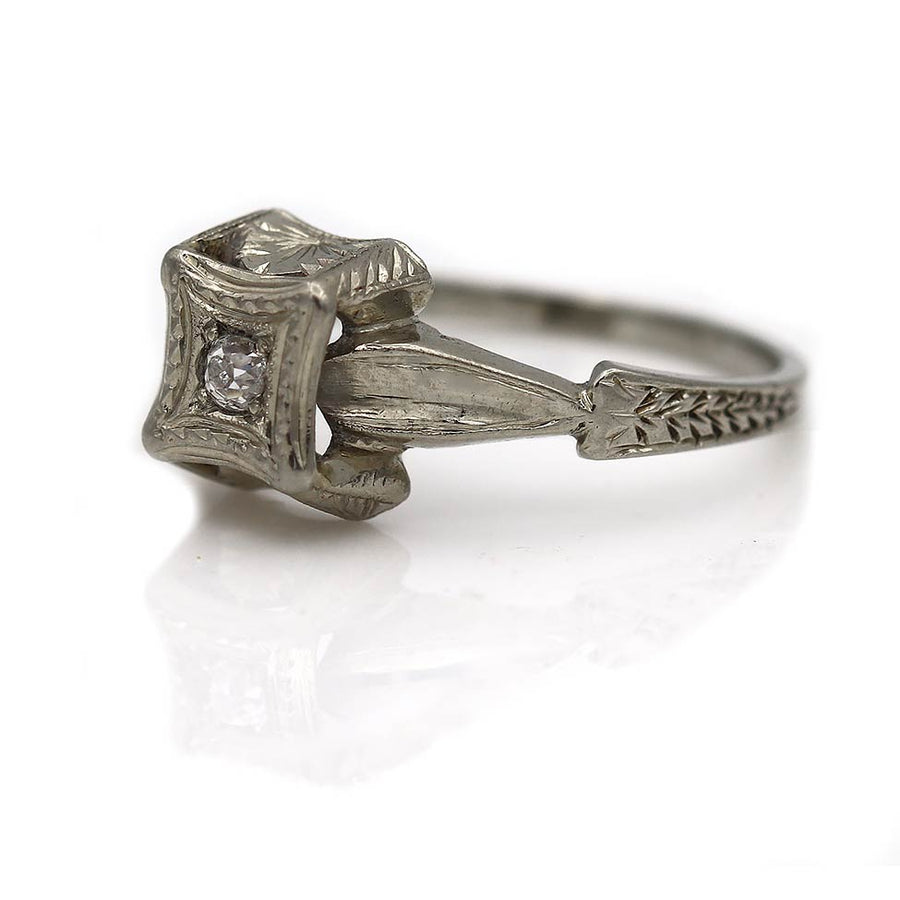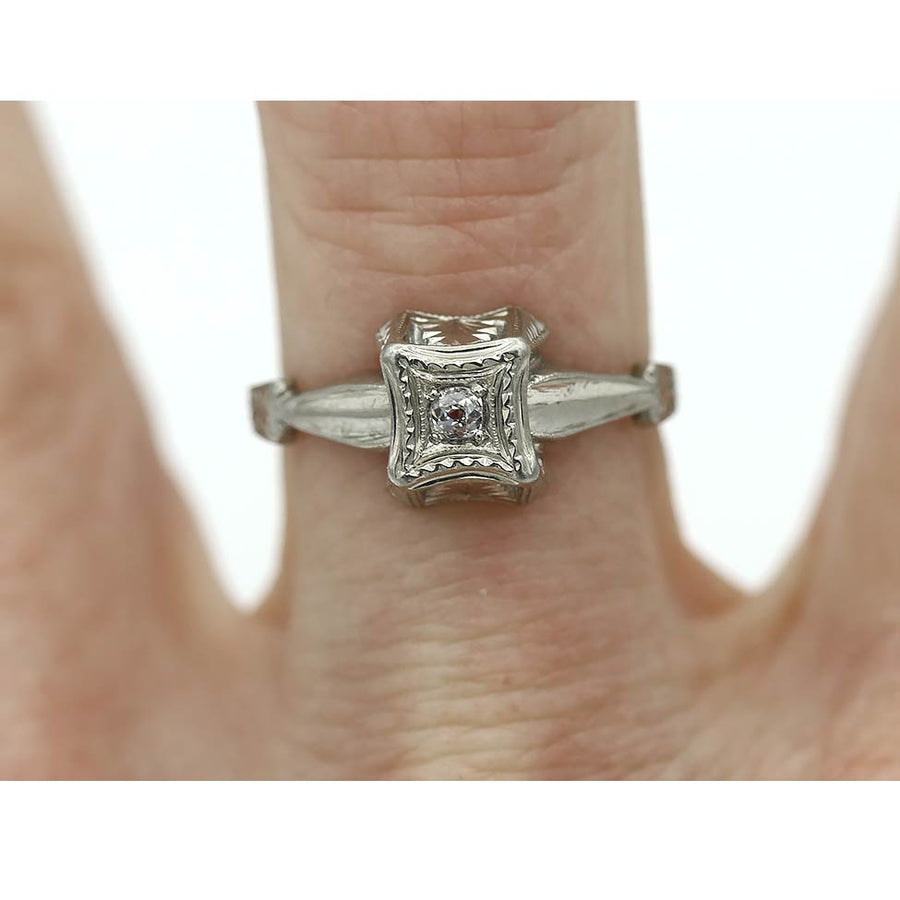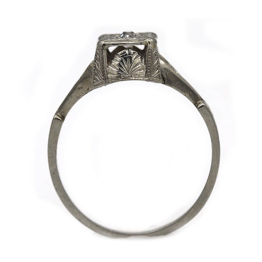 The Pauline ring is an authentic vintage diamond engagement ring from the Art Deco era circa 1930's. The ring showcases a .08 carat old mine-cut diamond of G color, VS2 clarity, residing in a two tiered geometric frame. Crafted in 14 karat white gold, beautifully finished with slightly tapered shoulders, delicate filigree engravings and a thin fluted band. A delightful vintage ring, in very good condition.