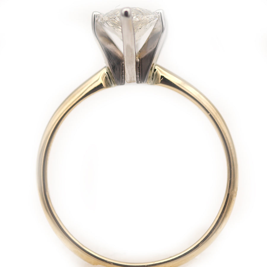 The Twigs ring is an authentic vintage diamond engagement ring from the 1990s. This elegant solitaire features a 1.51 carat marquise-cut diamond accompanied by a GIA report, graded H color and I1 clarity. Set in a classic two-tone 14 karat gold solitaire mounting, the diamond is beautifully elevated to showcase its elongated shape and brilliance. A timeless vintage engagement ring, offered in very good condition.