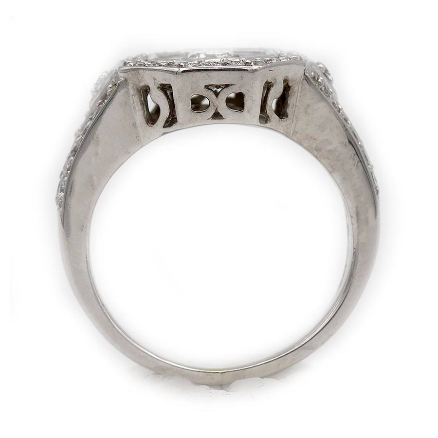 The Bretta ring is an authentic vintage engagement ring from the 1980s. This elegant design centers a bright white illusion-set emerald cut diamond, framed by eight shield-cut diamonds and forty-eight round-cut diamond accents that enhance its presence and sparkle. Beautifully crafted in 14 karat white gold, the ring reflects the bold yet refined style of the era. A lovely vintage engagement ring in very good condition.
