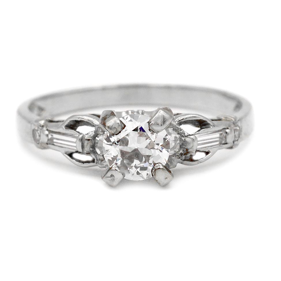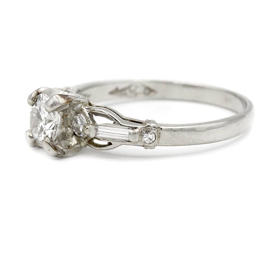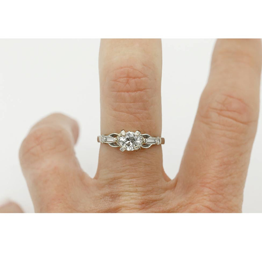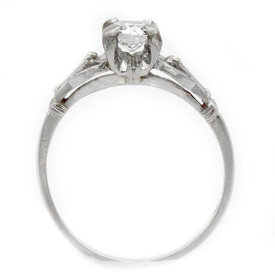 Mid-Century .50 Ct Old European Cut Diamond Engagement Ring with Baguettes in 18K White Gold