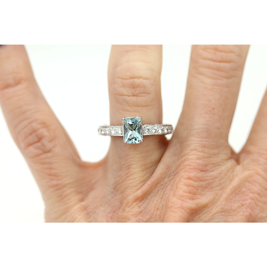 The Jarnely ring is an authentic vintage gemstone engagement ring dating to the 1980s. It features a natural emerald-cut aquamarine weighing approximately .90 carats, admired for its soft sky-blue hue. The center stone is flanked by thirty-six (36) round-cut diamond accents totaling approximately 1.20 carats. Beautifully crafted in 14K white gold and finished with delicate milgrain engravings, this striking vintage ring is offered in very good condition.
