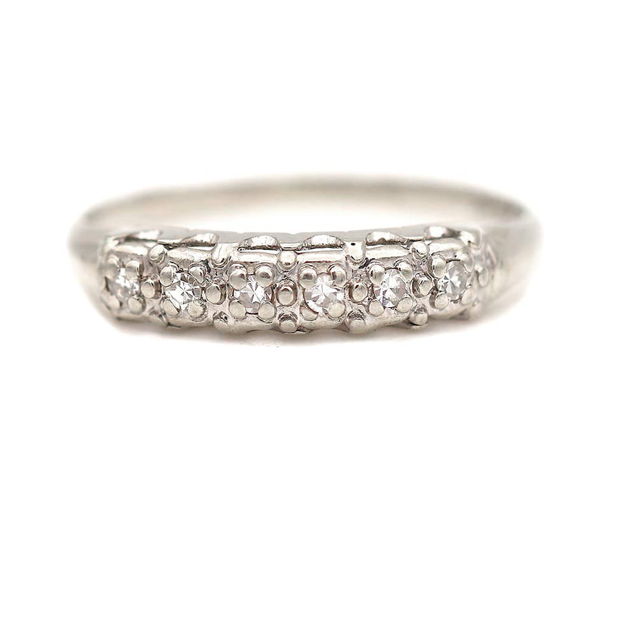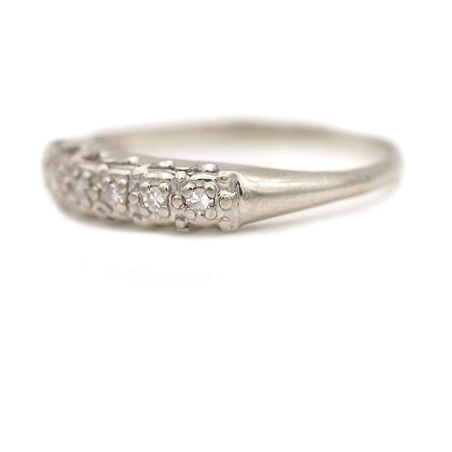 Kena is an authentic vintage wedding band circa 1950's. The wedding band features six (6) prong set single cut diamonds, weighing .12 carat (G color and VS2 clarity). Crafted in 14kt white gold. A perfect band to stack or wear with your favorite vintage ring. In very good condition, this band measures 3.5 wide tapering to 3.1 and 1.4 at the bottom.
