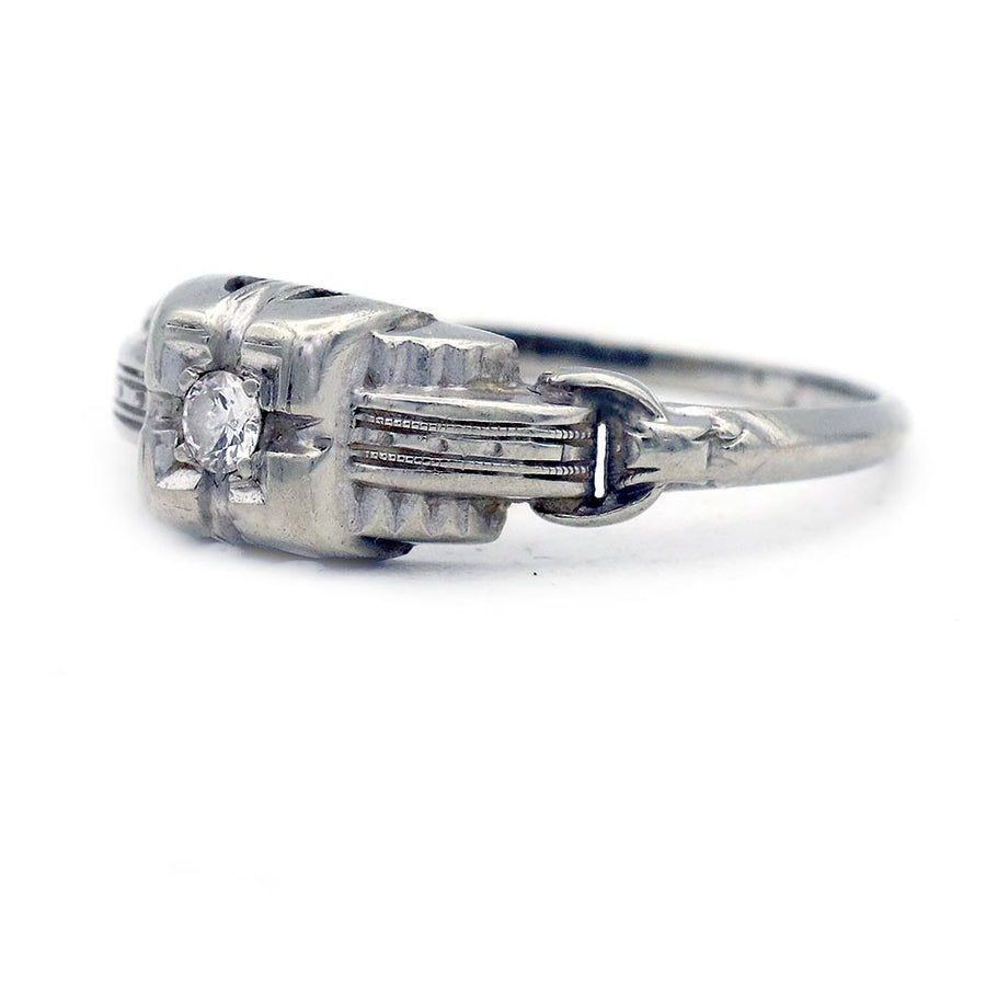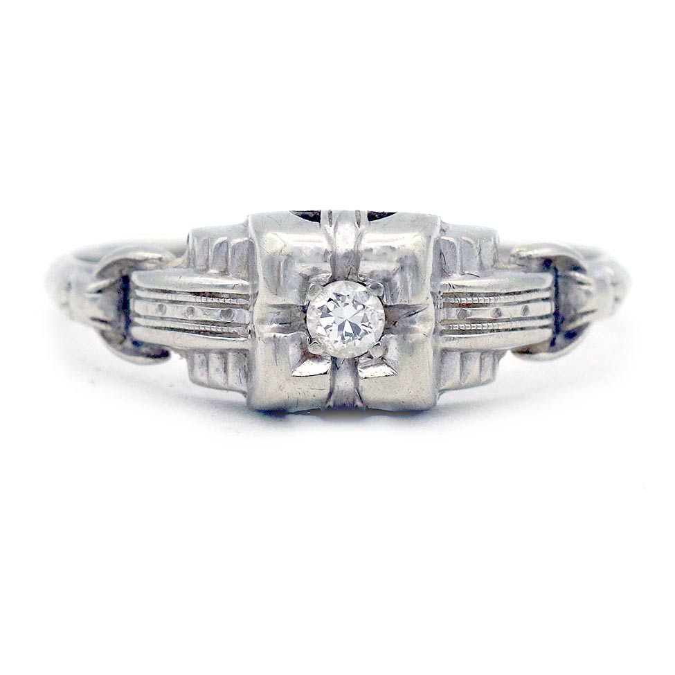 The Beri ring is an authentic vintage engagement ring from the Art Deco era, circa 1930s. It features a .08 carat Old European cut diamond of H color and VS2 clarity, set within a crisp two-tiered geometric square frame. Handcrafted in 18 karat white gold and finished with delicate filigree engravings, this petite Art Deco piece is both refined and timeless, preserved in very good condition.