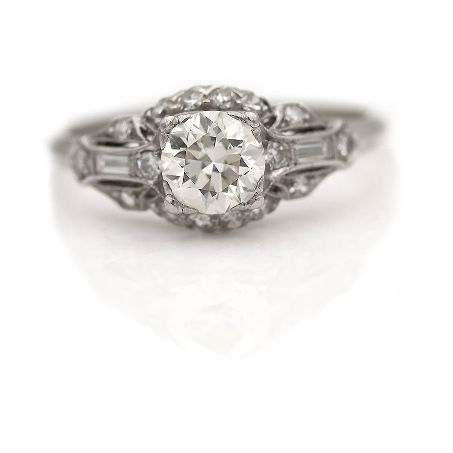 The Kenari ring is an authentic vintage engagement ring from the Art Deco era, circa 1930's. This ring boasts an AGI certified .75 carat old European cut diamond of I color and VS2 clarity. This diamond resides in a geometric square frame, flanked by two (2) straight baguette diamonds and twelve (12) single cut diamond accents. Hand-crafted in platinum and accentuated with open metal work and delicate milgrain engravings. A rare and timeless vintage piece! In very good condition.xv-v,x1v1