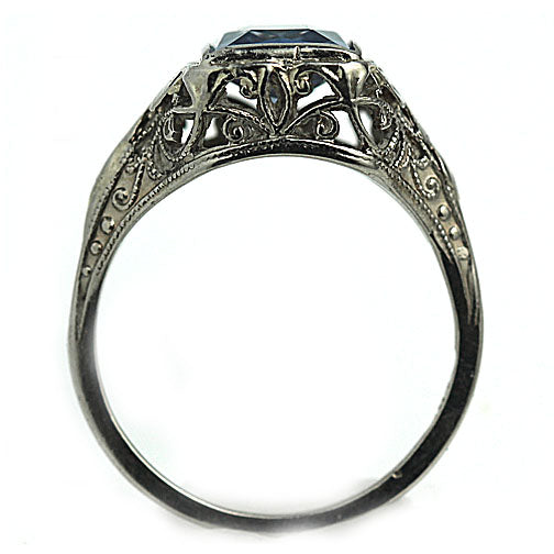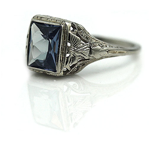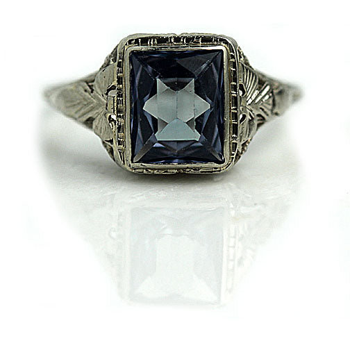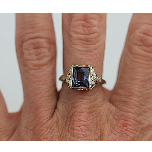 The Kattie ring is an authentic Art Deco engagement ring circa 1920's. The ring features a synthetic 1.50 carat rectangular cut color change synthetic alexandrite. (purple and blue). Crafted in 14 karat white gold, adorned with open metal work and filigree engravings. A showstopping vintage piece. Perfect to wear on either hand. In very good condition.