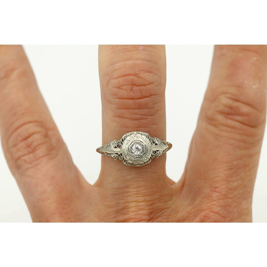 The Lilianna ring is an authentic vintage engagement ring from the Art Deco era circa 1920's. The ring features a glistening .15 carat old European cut diamond of F color, VS2 clarity, residing in a geometric octagonal frame. Crafted in 14 karat white gold, completed with intricate open metal work and floral engravings. A timeless vintage piece with intricate detailing. In very good condition. They don't come any finer.
