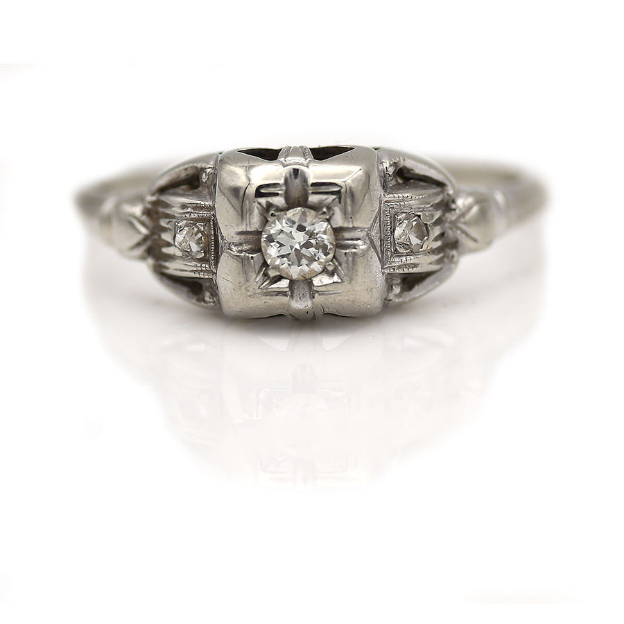 The Illysa ring is an authentic antique promise ring circa 1920s. The ring features a .10 carat old European cut diamond of H color and SI1 clarity, residing in a geometric square frame. The diamond is flanked by two (2) old European cut diamond accents. Crafted in 18 kt white gold, accentuated with delicate milgrain and filigree engravings. A classic promise ring, in very good condition.