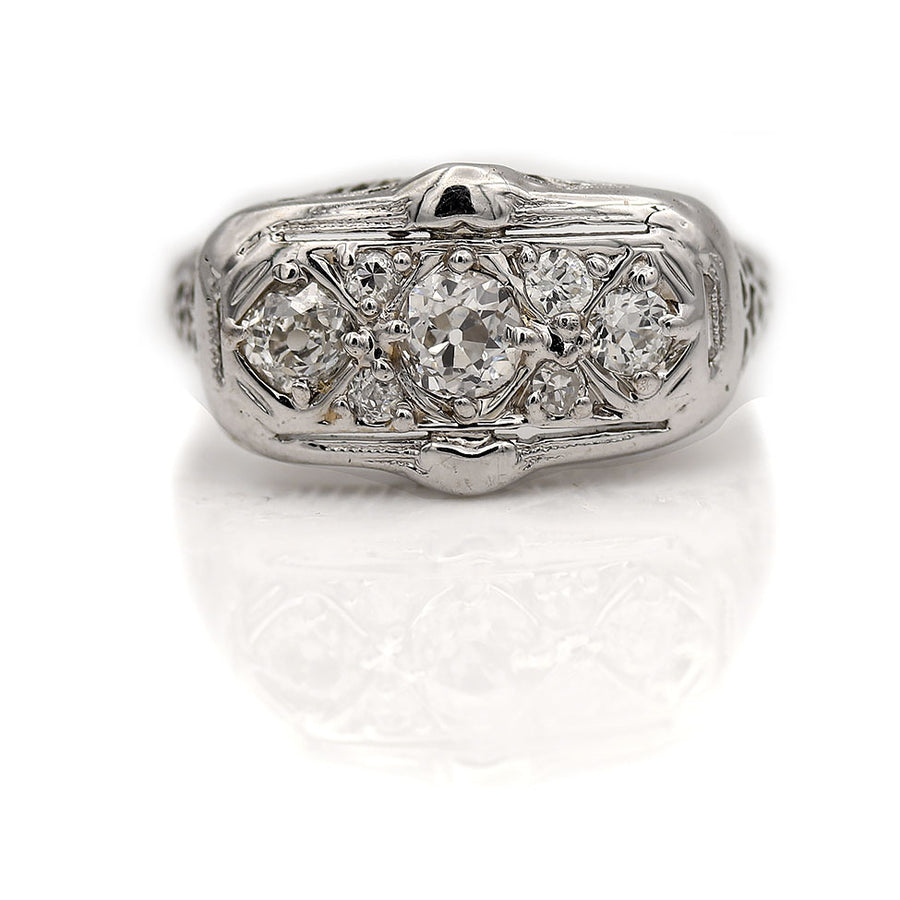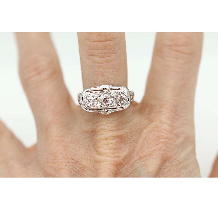 The Kerri ring is an authentic vintage engagement ring from the Art Deco era circa 1930's. The ring features 3 old mine-cut diamonds weighing .35 carats of H color, VS2 clarity, complemented by 4 dainty mine cut diamond accents. Crafted in 14 karat white gold, accentuated with open metal work. A unique low profile ring. Perfect to wear on either hand or to stack with other bands. In very good condition.