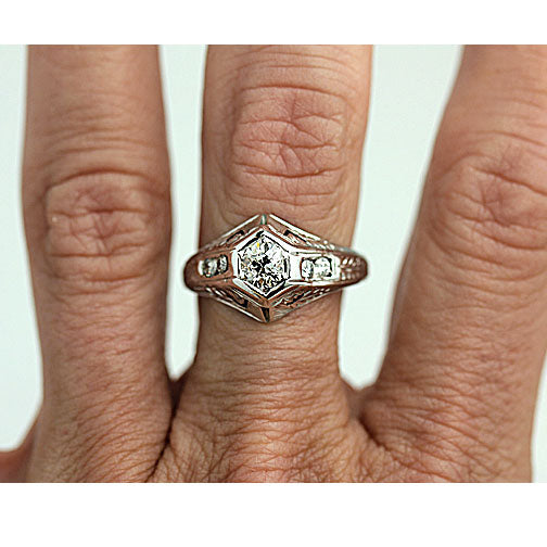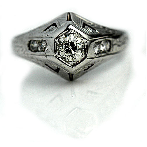 The Mika B ring is an authentic vintage diamond ring from the Art Deco era circa 1940's. The ring features a glittering AGI certified .50 carat old mine cut diamond of J color, VS2 clarity, residing in a geometric hexagonal frame. The diamond is flanked by 4 single cut diamond accents. Crafted in 14 karat white gold, completed with delicate filigree detailing. A cool, chic vintage piece with a touch of light patina. Perfect for either hand. In good condition.