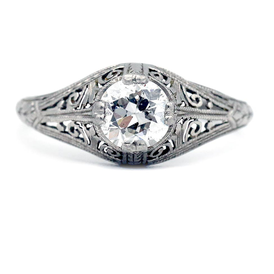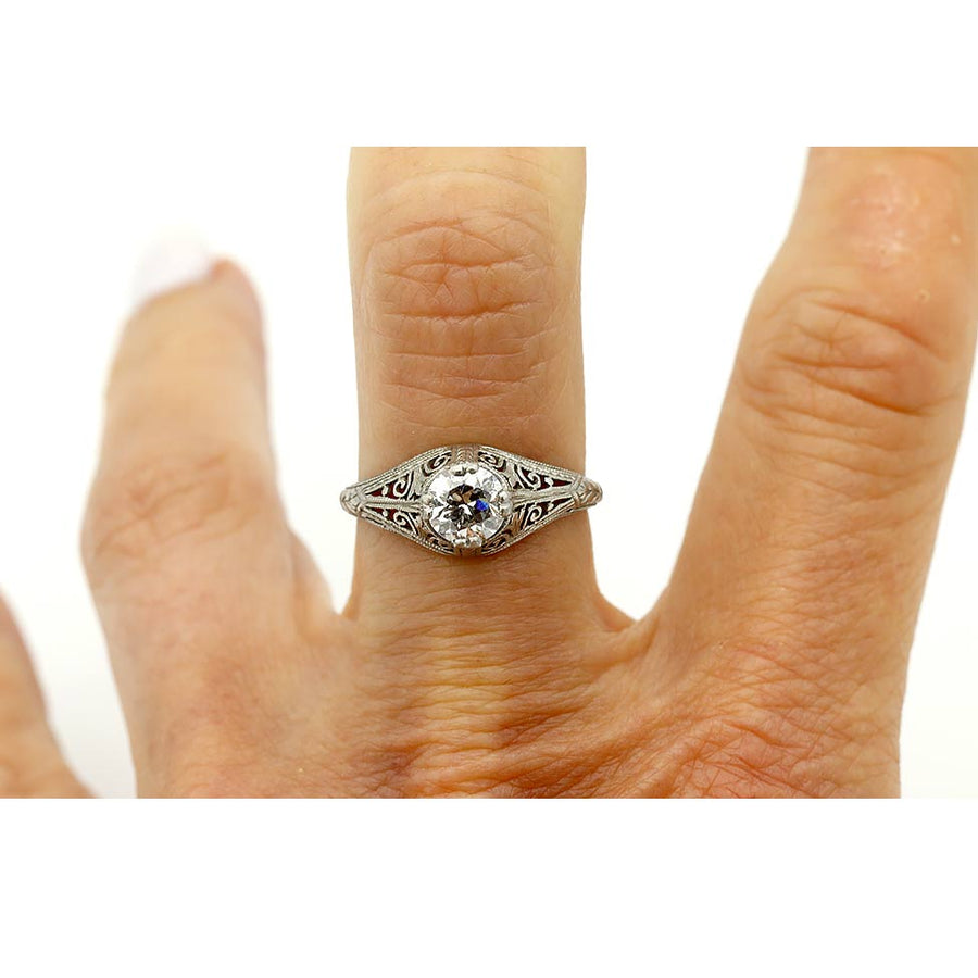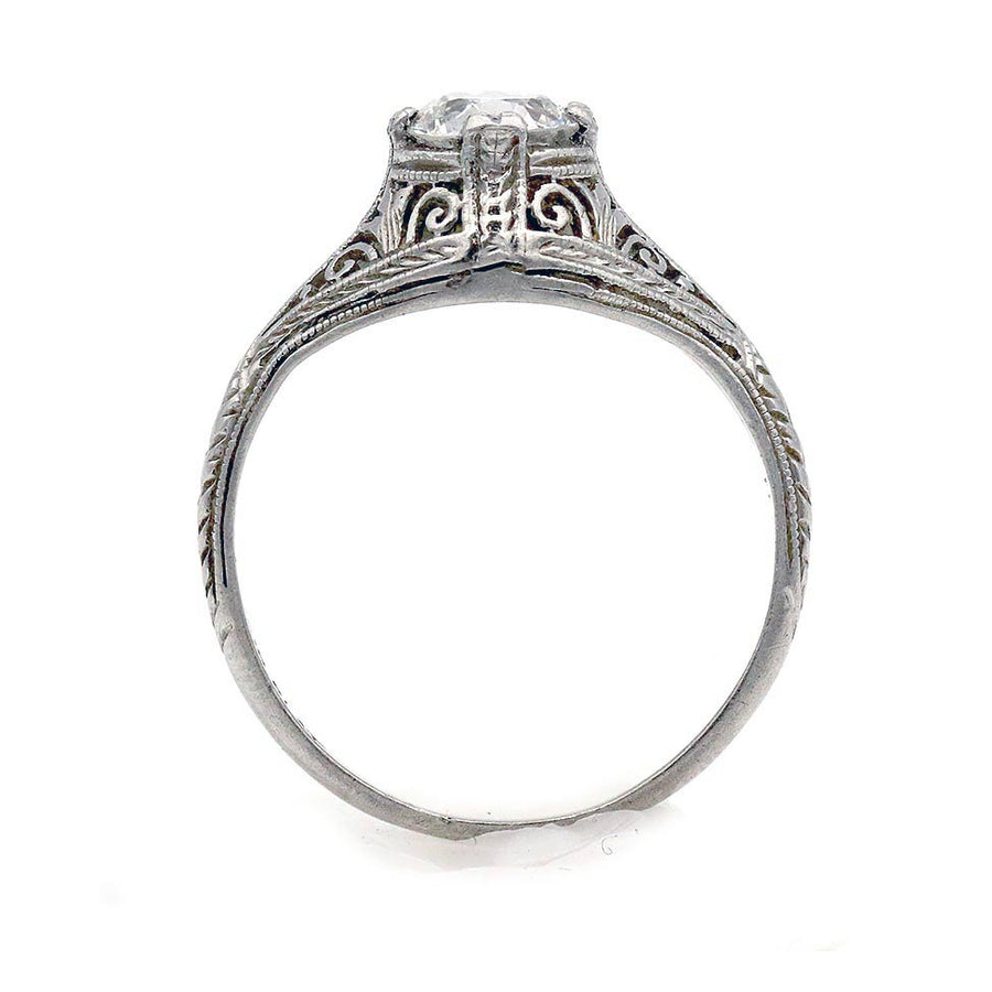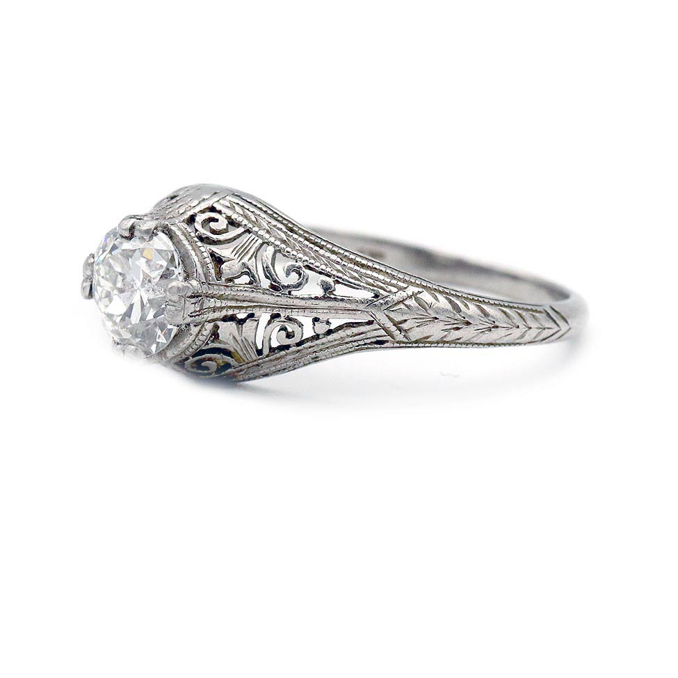 The Ali ring is an authentic antique engagement ring from the Art Deco era, dating to the 1930s. It features a GIA-certified .69 ct old European cut diamond of G color and SI1 clarity, offering bright white brilliance and classic, well-balanced proportions. The ring is finely crafted in platinum and highlighted by graceful swirling metalwork and intricate filigree engravings, reflecting the refined craftsmanship of the period. A timeless and sophisticated design, this Art Deco ring is a striking example of early twentieth-century jewelry. In very good antique condition.