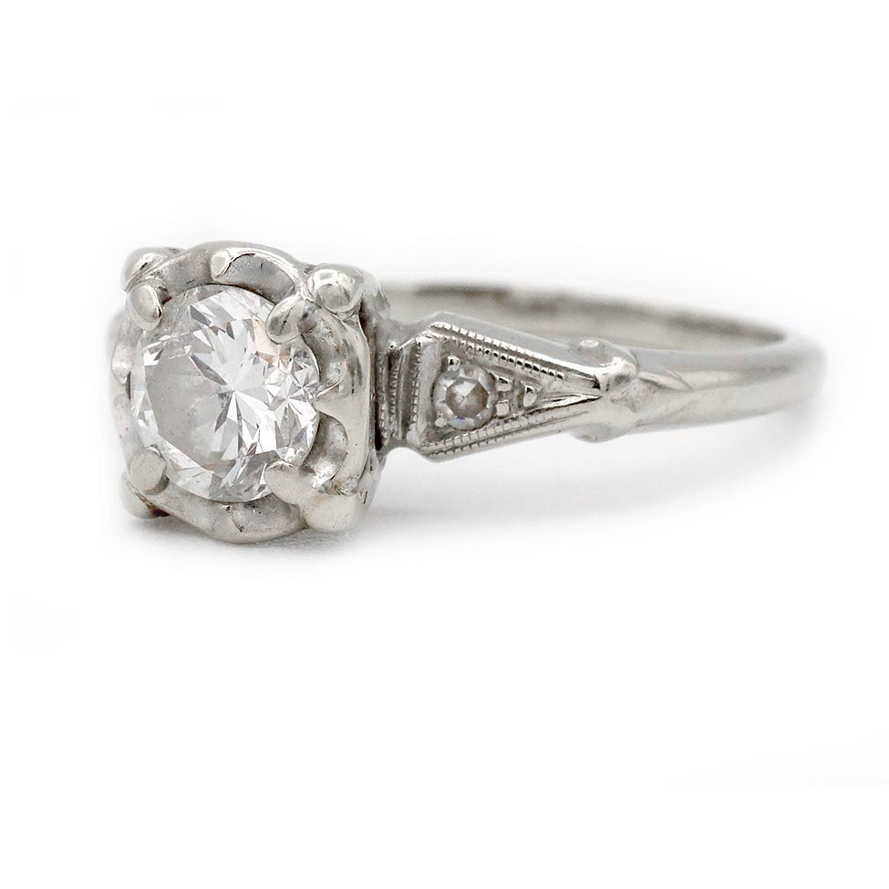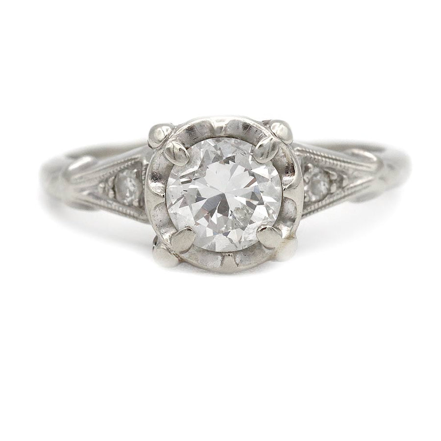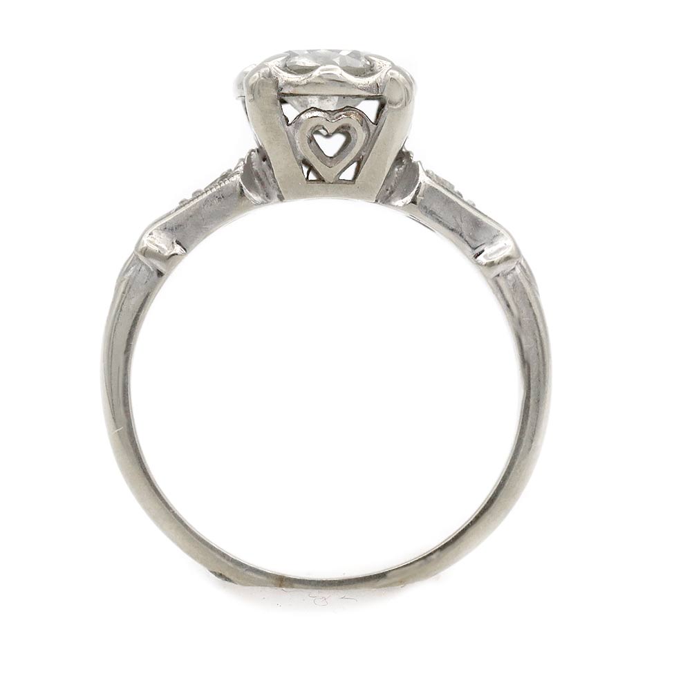 The Reeves ring is an authentic vintage three stone engagement ring dating to the 1940s. It features an old European cut diamond of J color and I1 clarity, flanked by two single cut diamond accents that lend balance and symmetry to the design. Beautifully crafted in 14K white gold, the setting is accented with charming heart filigree engravings characteristic of the period. A classic Mid-Century engagement ring with romantic detailing, preserved in good vintage condition.